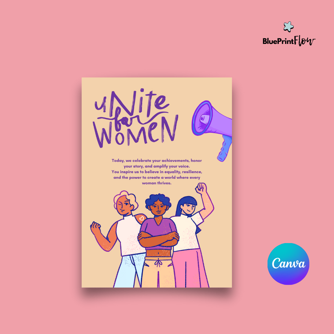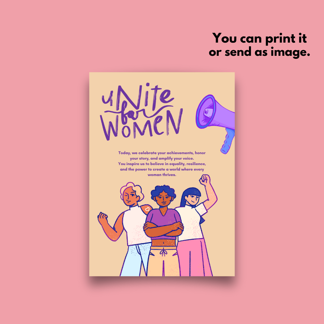 Featuring a vibrant cartoon aesthetic and bold “Unite for Women’s” text focus, this design is perfect for honoring women’s rights and leadership. Ideal for enterprises, friends, and coworkers, it combines professionalism with a touch of creativity.