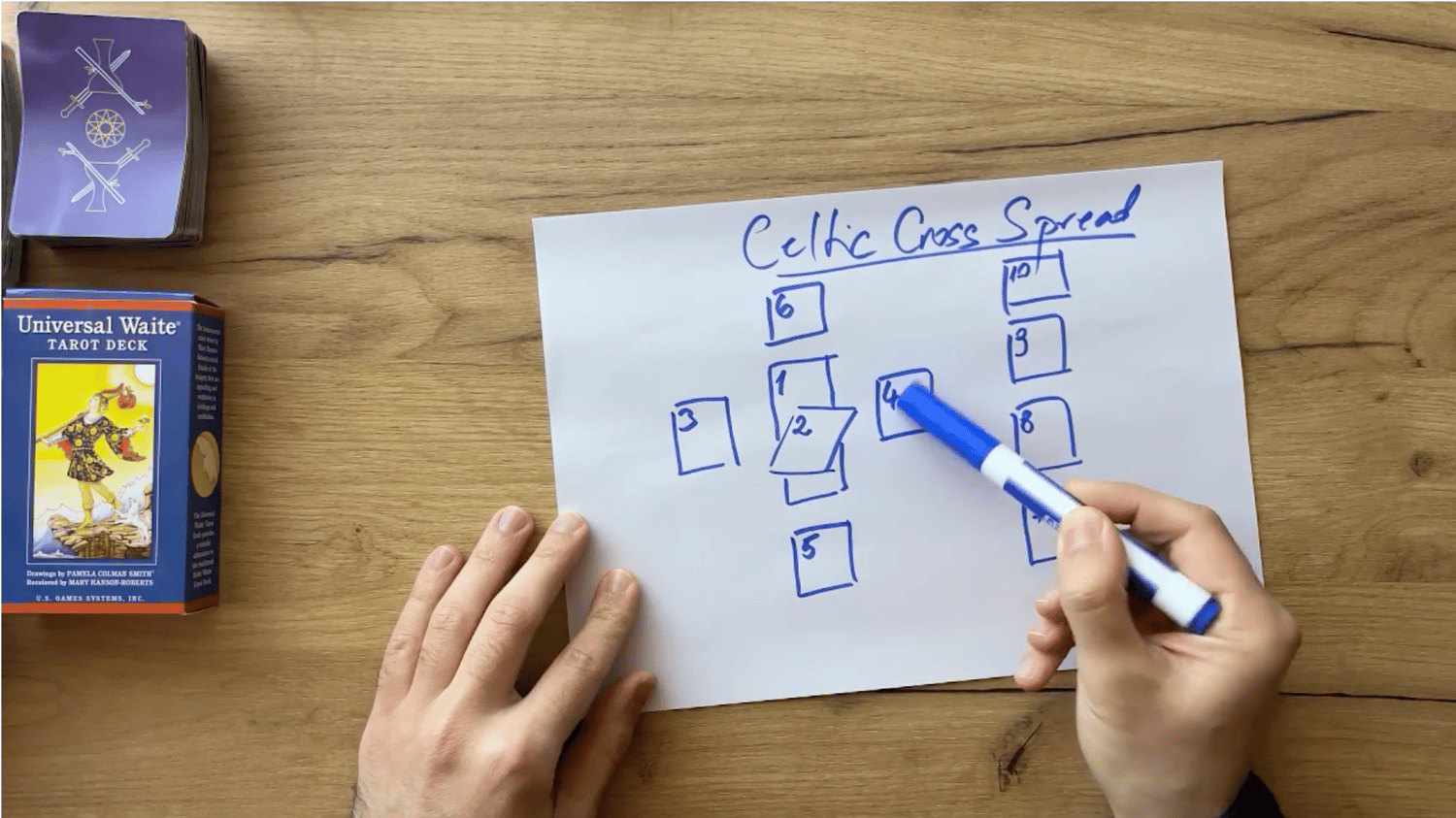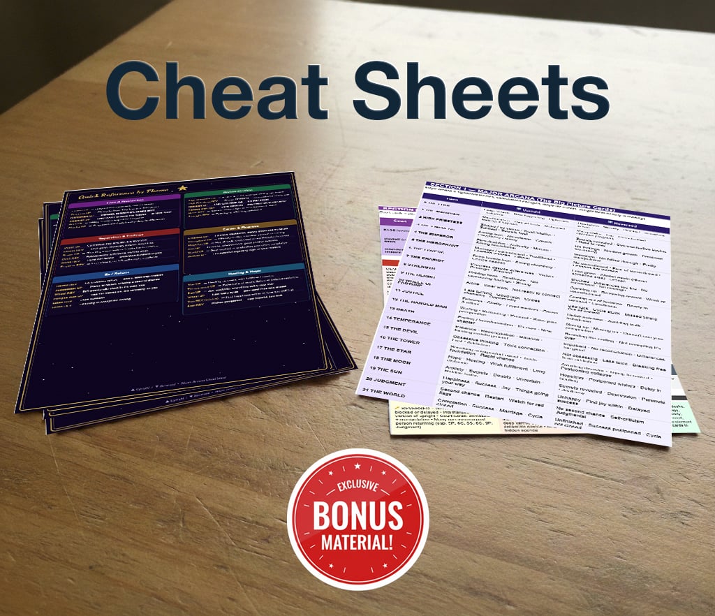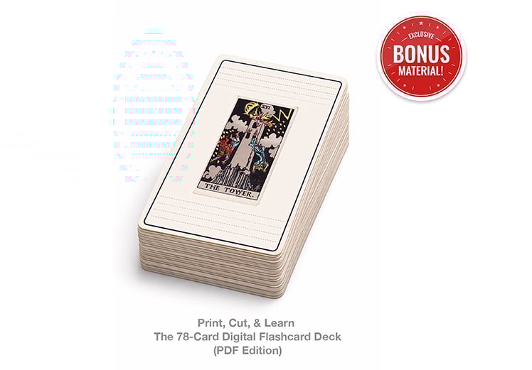 Print and cut your tarot flashcards, with space to write upright and reversed meanings from the lessons—so you learn faster and practice making clear stories with the cards.