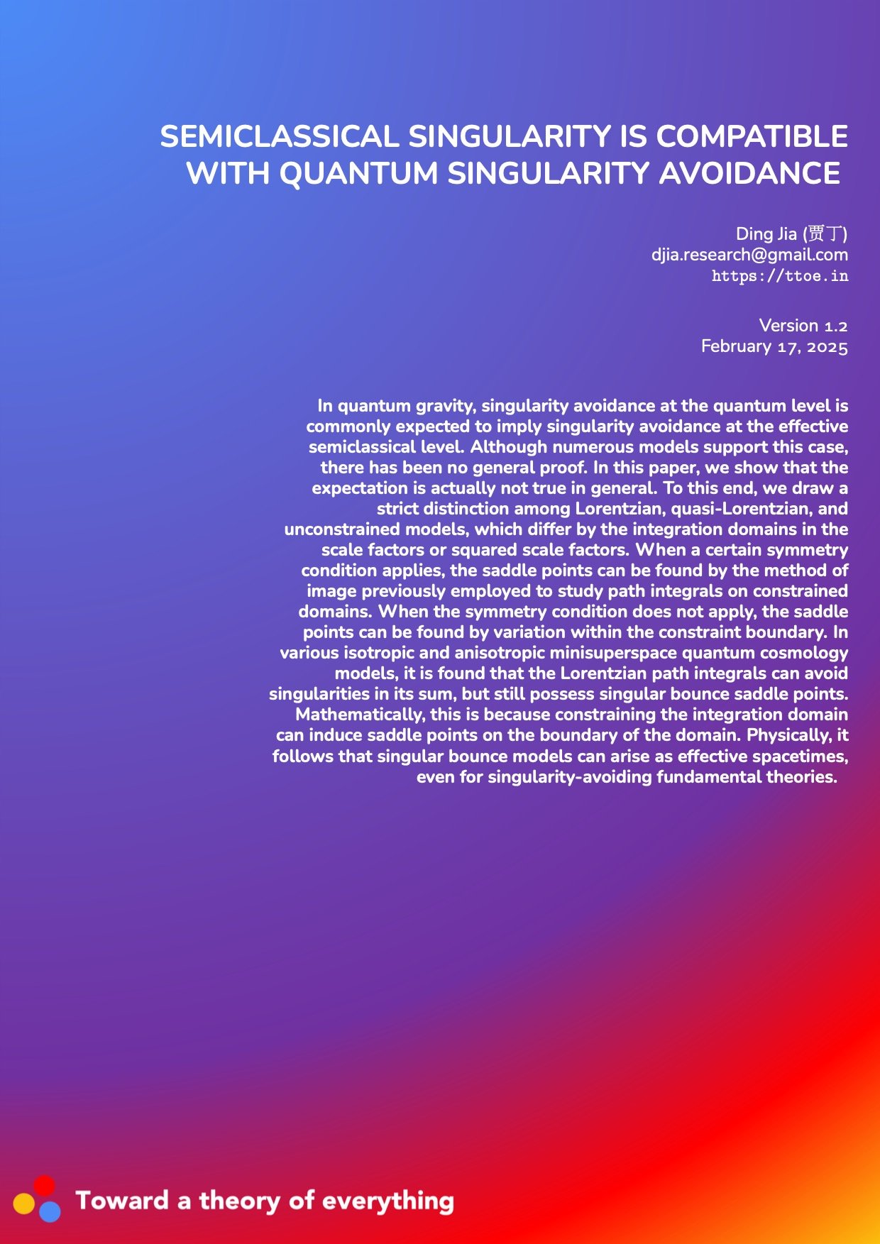 Abstract: In quantum gravity, singularity avoidance at the quantum level is commonly expected to imply singularity avoidance at the effective semiclassical level. Although numerous models support this case, there has been no general proof. In this paper, we show that the expectation is actually not true in general. To this end, we draw a strict distinction among Lorentzian, quasi-Lorentzian, and unconstrained models, which differ by the integration domains in the scale factors or squared scale factors. When a certain symmetry condition applies, the saddle points can be found by the method of image previously employed to study path integrals on constrained domains. When the symmetry condition does not apply, the saddle points can be found by variation within the constraint boundary. In various isotropic and anisotropic minisuperspace quantum cosmology models, it is found that the Lorentzian path integrals can avoid singularities in its sum, but still possess singular bounce saddle points. Mathematically, this is because constraining the integration domain can induce saddle points on the boundary of the domain. Physically, it follows that singular bounce models can arise as effective spacetimes, even for singularity-avoiding fundamental theories.