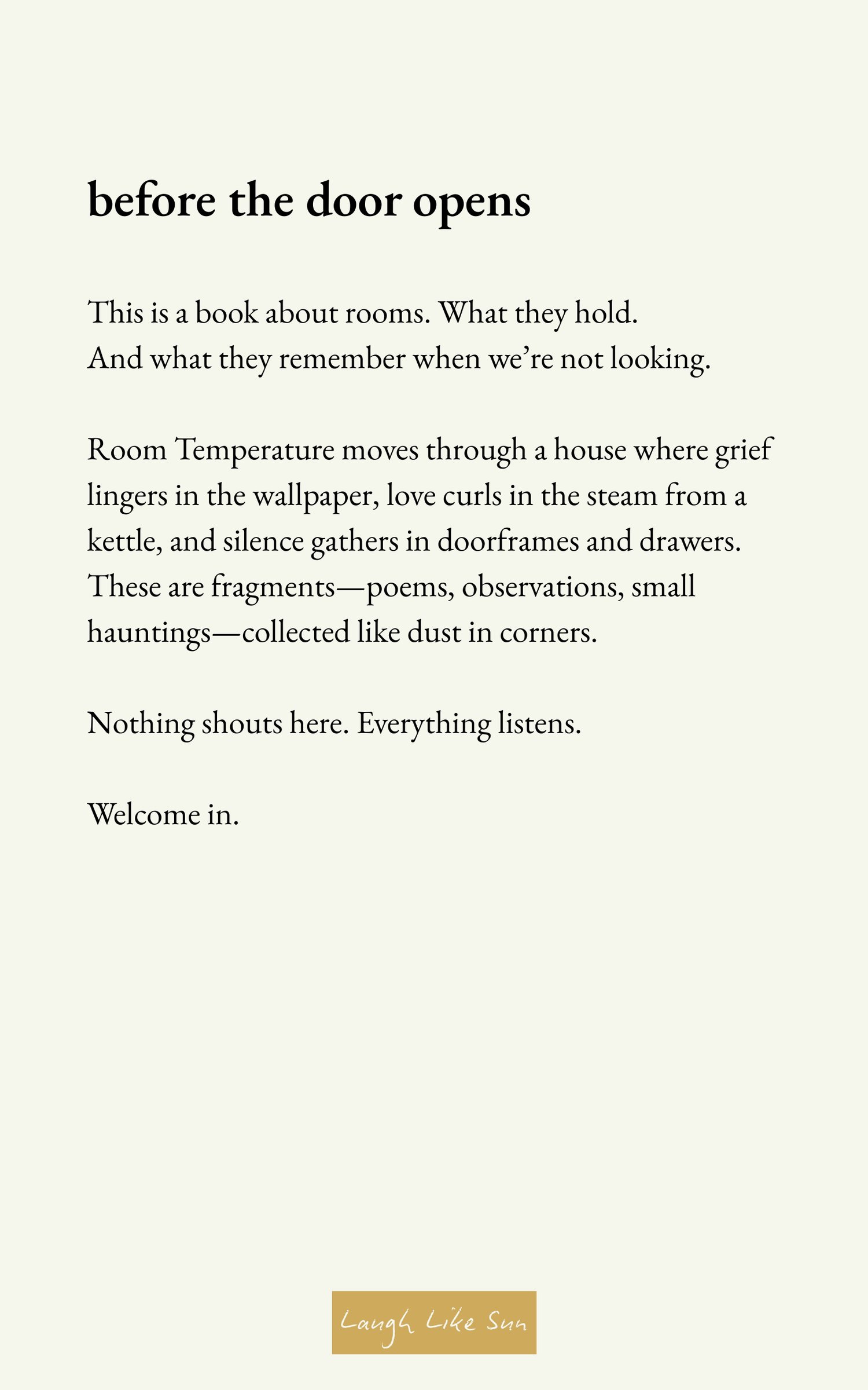 Through fragmentary prose and poetic vignettes, Room Temperature: Where the Light Falls traces the gentle terrain of memory, loss, and everyday grace. It asks what it means to inhabit a space — to hold what’s fading, to love what remains, to find warmth in the ordinary.