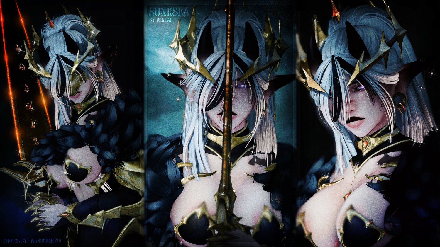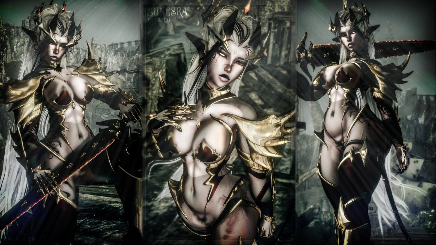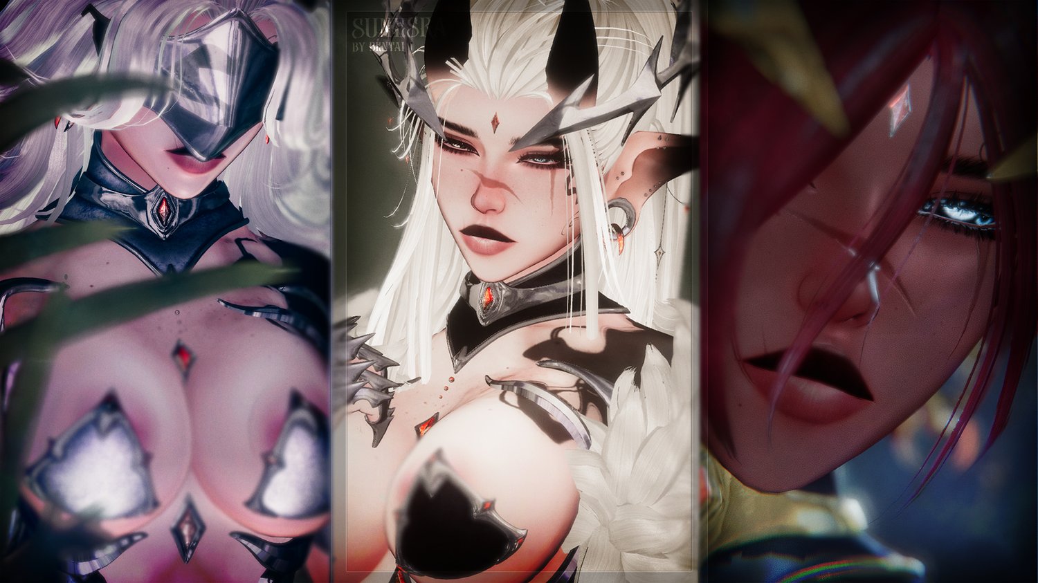Both Outfits Fully Commissioned By Bunisu & Rigged By Me : "Cloth Wraps, Forearm Guards, Hand Claws, Metal Straps, Shoulder Pads, Metal Chest & Hips, Body Gems, Full Chainmail fit (Bottom,Top,Face Veil), Crown, Face Plate, Drapery Plats & Cloths, Main Outfit Fit (Armor Corset, Top, Choker, Fur Boa, Bottoms), Boots, Ears, Horns, Tail, Transparent Mesh (Bottom & Top)"