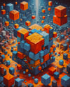 Throughout the series, the artist uses a palette of warm oranges, cool blues, and vivid pinks to create a sense of energy and life within these digital constructs. The intricate details on each cube suggest the complexity of digital systems, while their arrangement hints at the vast possibilities of creation in the digital age.