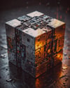 In the first image, we see a single, highly detailed cube sitting on a reflective surface. This cube seems to represent the core of digital creation - a complex, multifaceted object that holds endless possibilities within its confines.