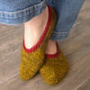 95 (110, 130) yards bulky weight yarn in MC for the slipper and 20 (20, 25) yards bulky weight yarn in CC for the crochet edging.