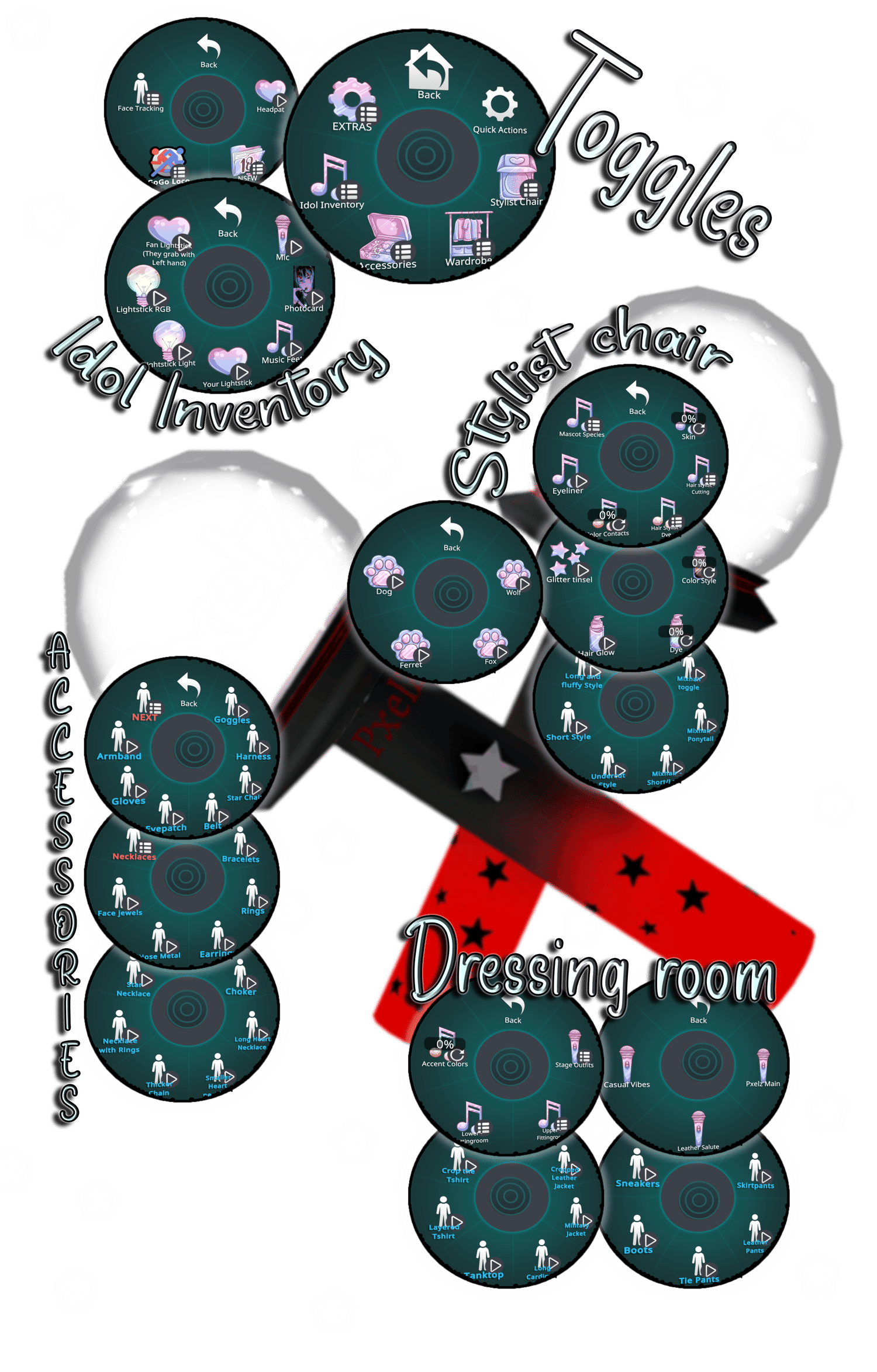 Lots of hair options both in color/texture and style of hair, pre-set "stage outfits" that you can mix and match as you want, Lots of references to kpop idols, your own light stick, makeup, light stick you can SHARE that actually lights up, hues and species options!