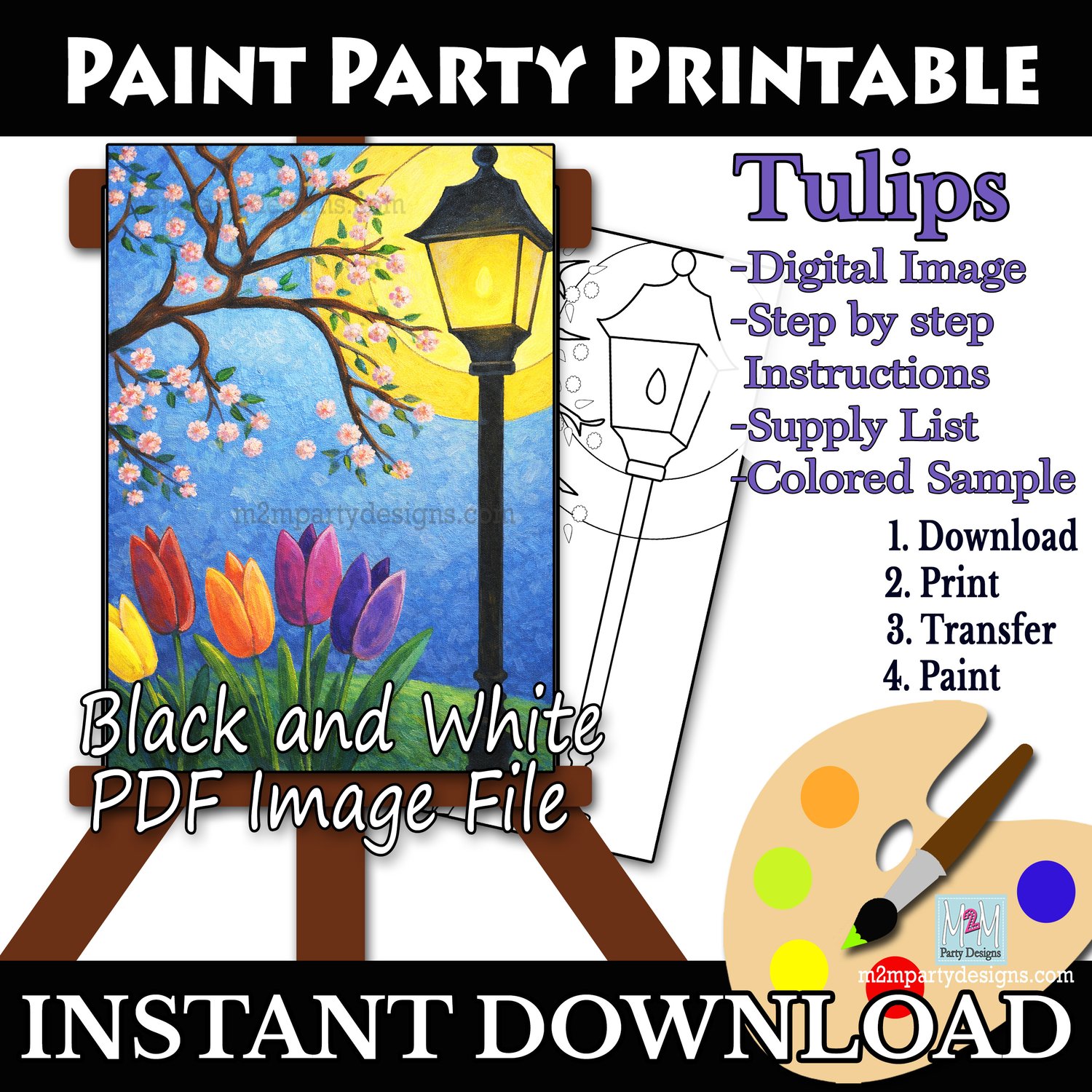 Spring Paint Party | Cherry Blossom Lantern Acrylic Painting | Tulip Garden Night Sky | Paint Night | Floral Canvas Art | Instant Download