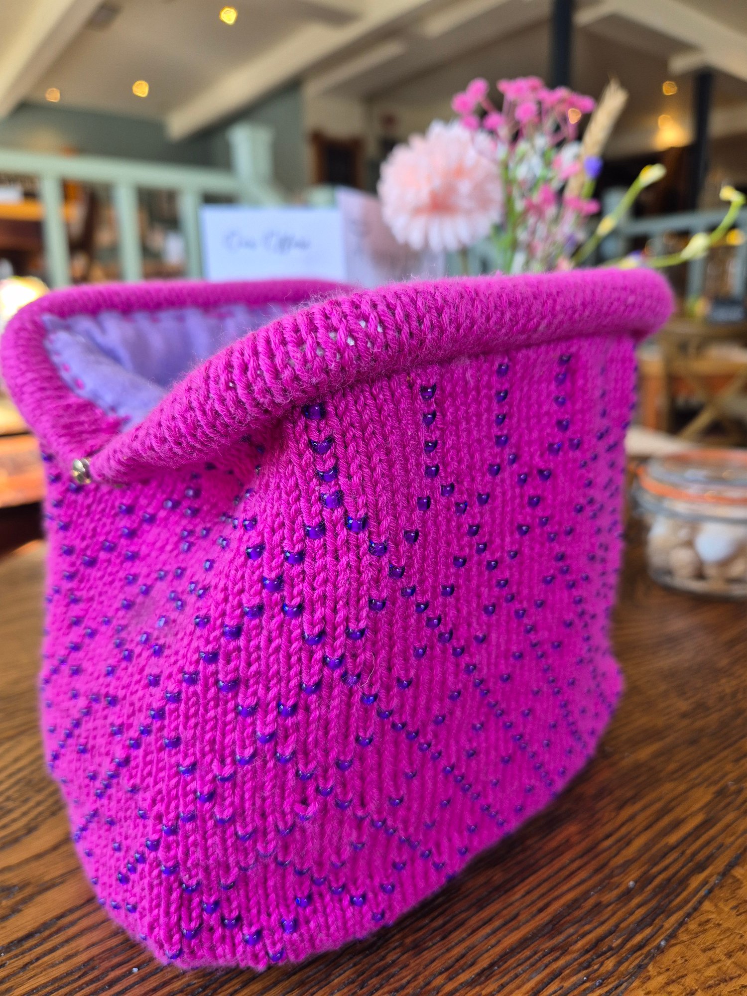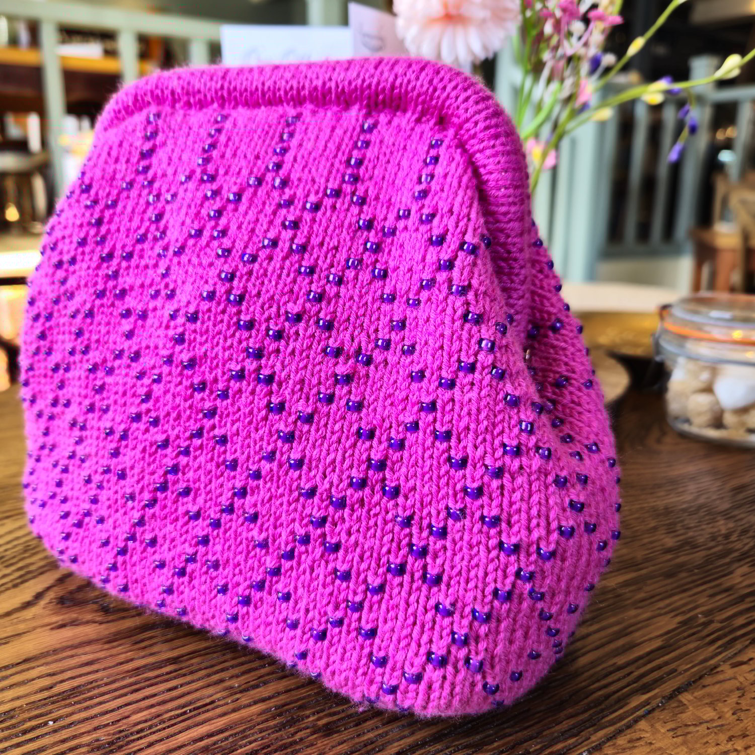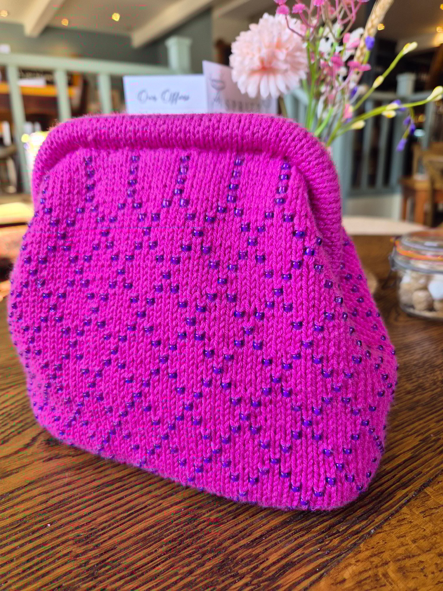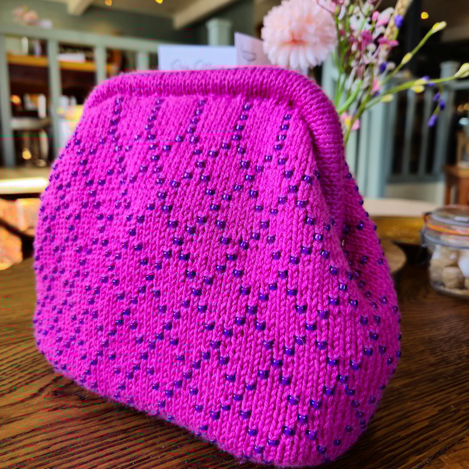 The Festival Clutch can be used to hold your essentials for running errands, for a night out or as a project bag. The metal frame and felt lining (see pattern notes) allows the bag to sit upright when open. Perfect for carrying your knitting project, your day or evening essentials such as purse, phone, lipstick etc. Beads are added using the crochet hook method (see page 2 for tutorial link).