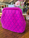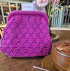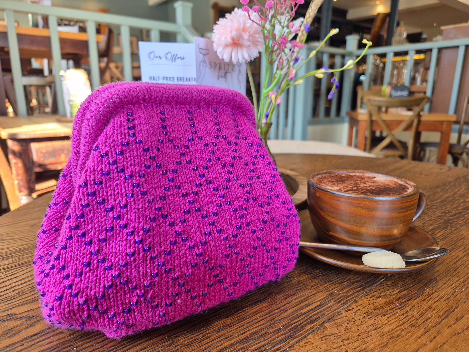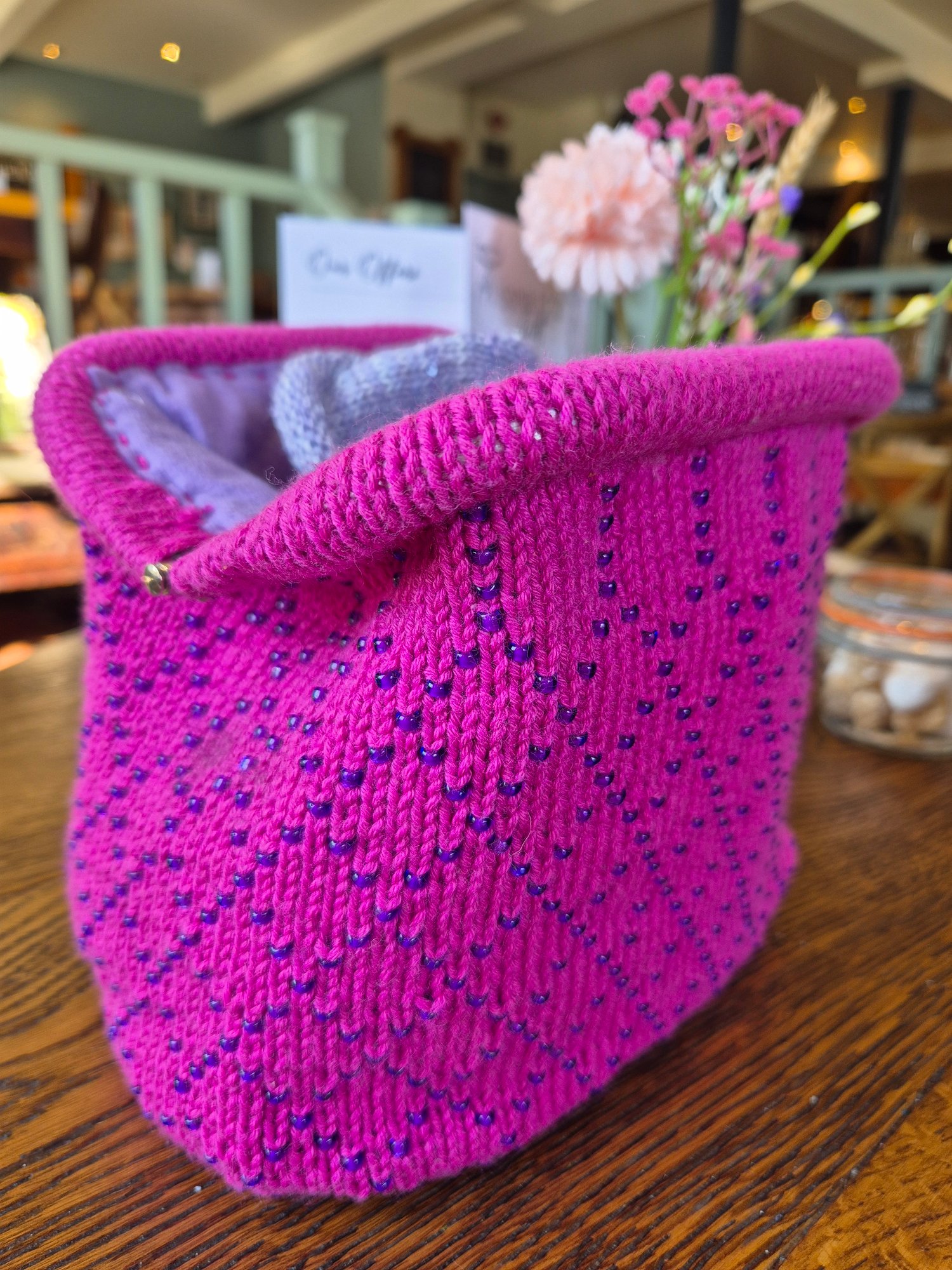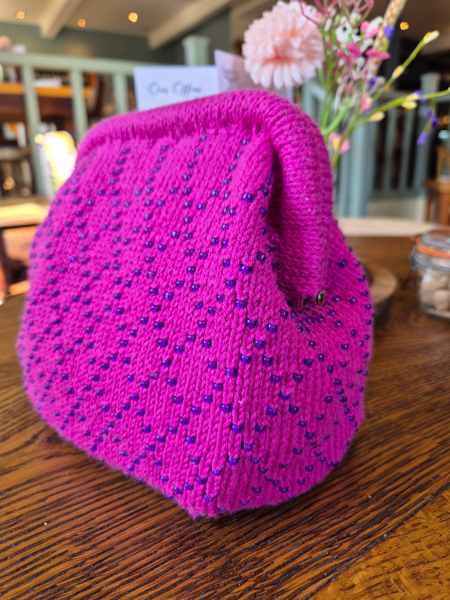 The Festival Clutch can be used to hold your essentials for running errands, for a night out or as a project bag. The metal frame and felt lining (see pattern notes) allows the bag to sit upright when open. Perfect for carrying your knitting project, your day or evening essentials such as purse, phone, lipstick etc. Beads are added using the crochet hook method (see page 2 for tutorial link).