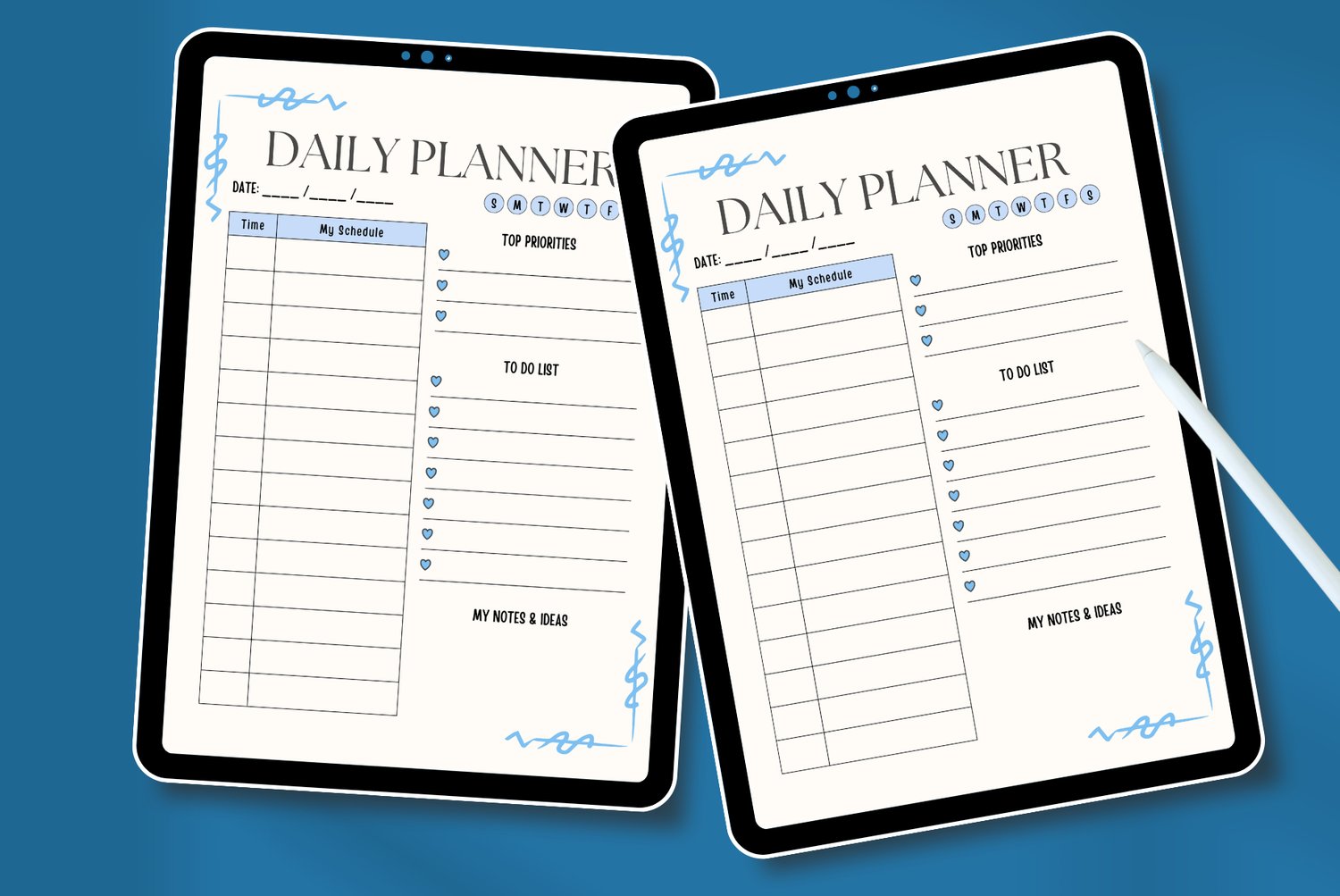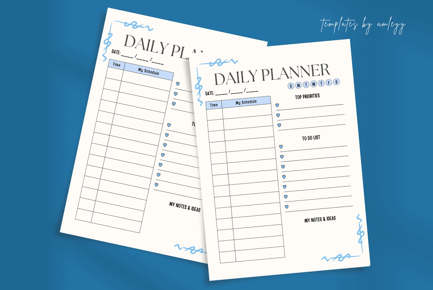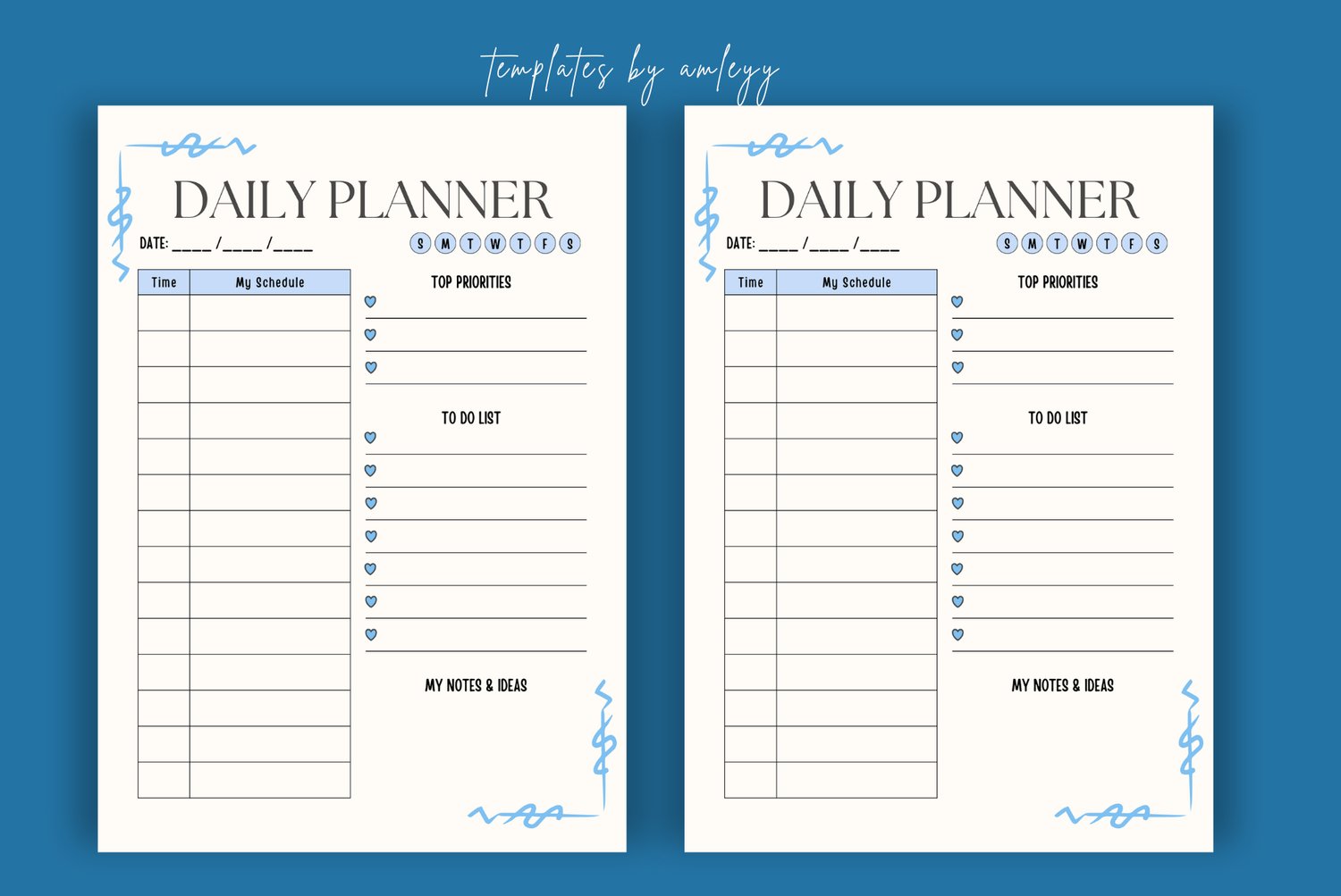 Keep your day organized and visually appealing with this blue-themed daily planner. Its clean layout helps you prioritize tasks, set goals, and stay on top of your daily routine.