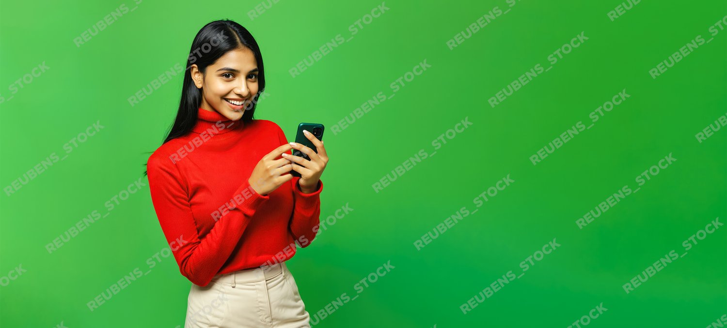 Happy Indian Female Using Smartphone Against Green Background