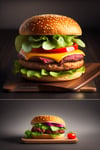 Hamburger patties, pickles, cheese, tomatoes.