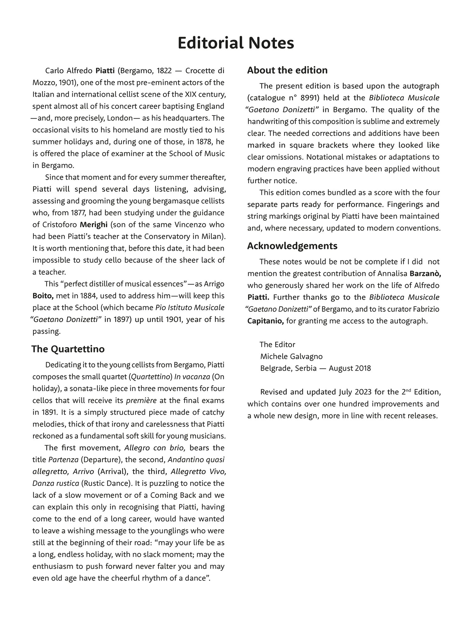 Piatti composed the small quartet (Quartettino) In vacanza (On holiday), a Sonata-form in three movements for four cellos, dedicating it to the young cellists from Bergamo in 1891. It was premiered at the final exams in the same year.