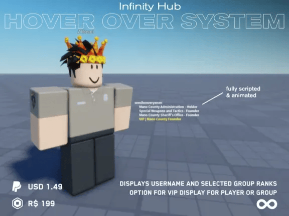 when you hover your mouse over a player, immediately displays essential information such as their username, affiliated groups, ranks, and VIP status (if they have one). Primarily utilized in military games, it serves as an effective and streamlined alternative to traditional overhead info displays. allowing players to quickly get a sense of who they're interacting with without overwhelming them with details.