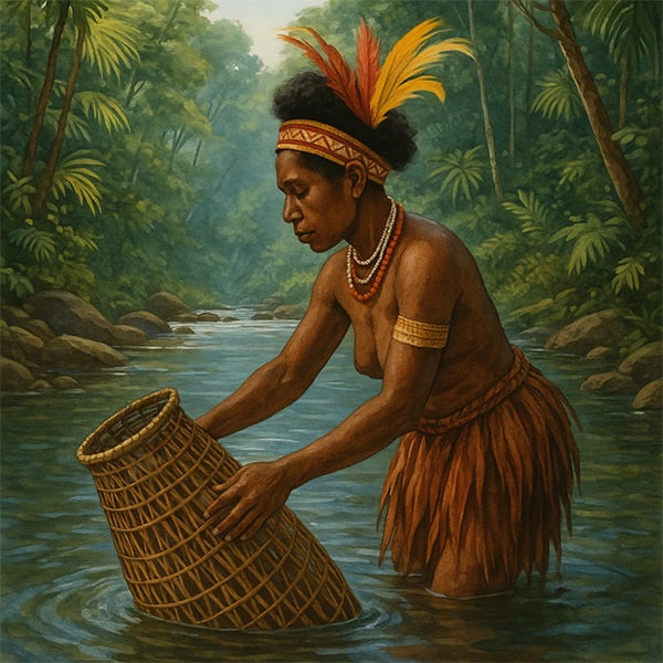 Papua New Guinea art, Sepik culture, traditional PNG mother, basket fishing, rainforest woman, indigenous ritual, PNG village life, cultural heritage print, Melanesian strength, tribal lifestyle, mother fishing art, morning river scene, earthy tones wall art, Pacific island traditions, handwoven basket trap, oceanic illustration, PNG rainforest, ancestral skills, native women artwork, mother’s role in culture