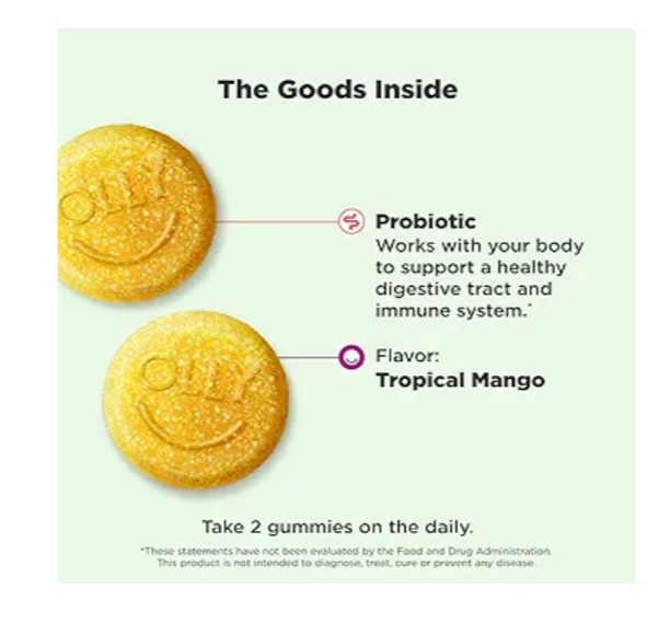 OLLY PROBIOTIC GUMMY SUPPLEMENT: Go with your gut, and give it a boost with one billion live cultures of bacillus coagulans, probiotics that work with your body’s natural bacteria to help keep your gut flora thriving and your tummy healthy