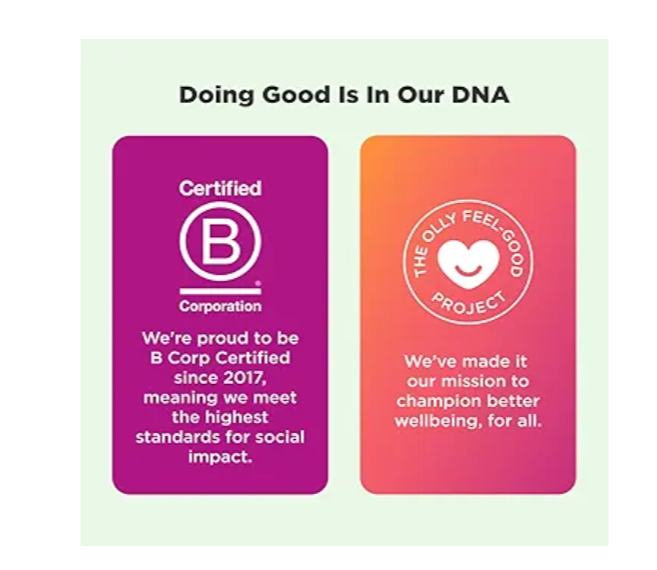 HI THERE. WE'RE OLLY: We've made it our personal mission to make nutrition easy to understand, so you can pursue good health without compromise. Taking nutritional supplements shouldn't be a chore which is why ours are as effective as they are fun.