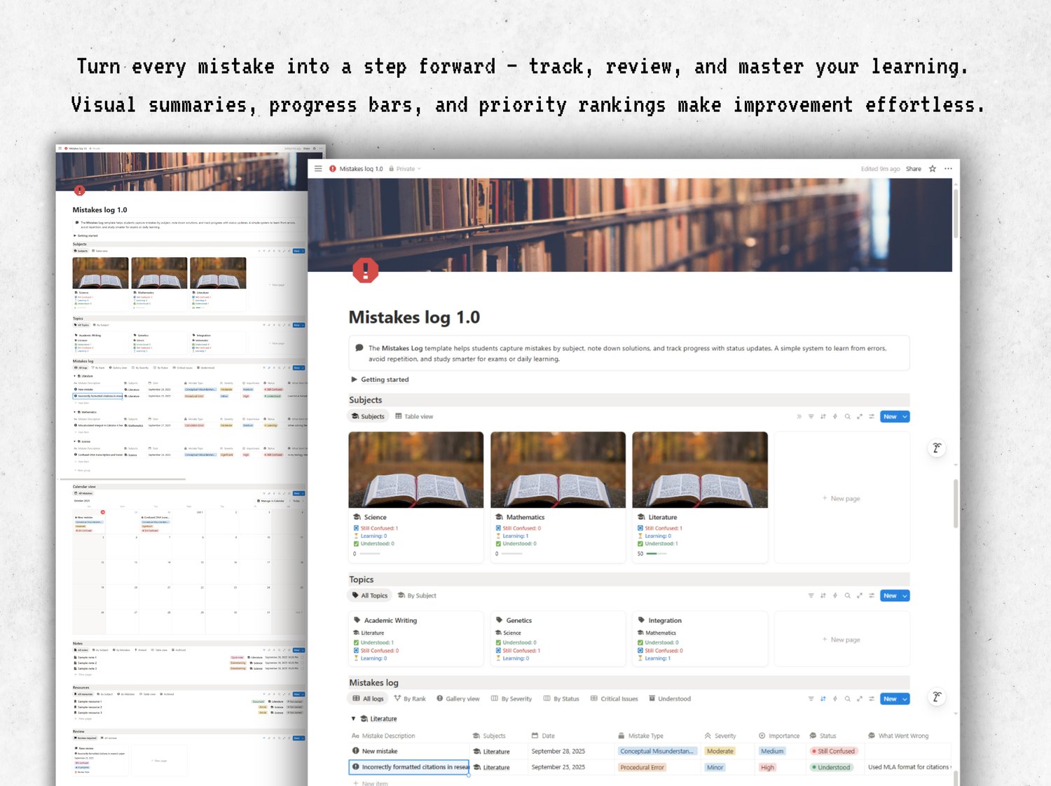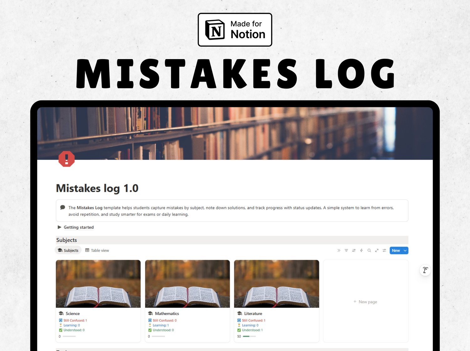 Mistakes Log 1.0 is a comprehensive learning system in Notion designed to help you capture, track, and learn from every mistake. At its core, it lets you log mistakes with full context — what went wrong, why it happened, and the lessons learned — while organizing them across Subjects and Topics for a clear overview.