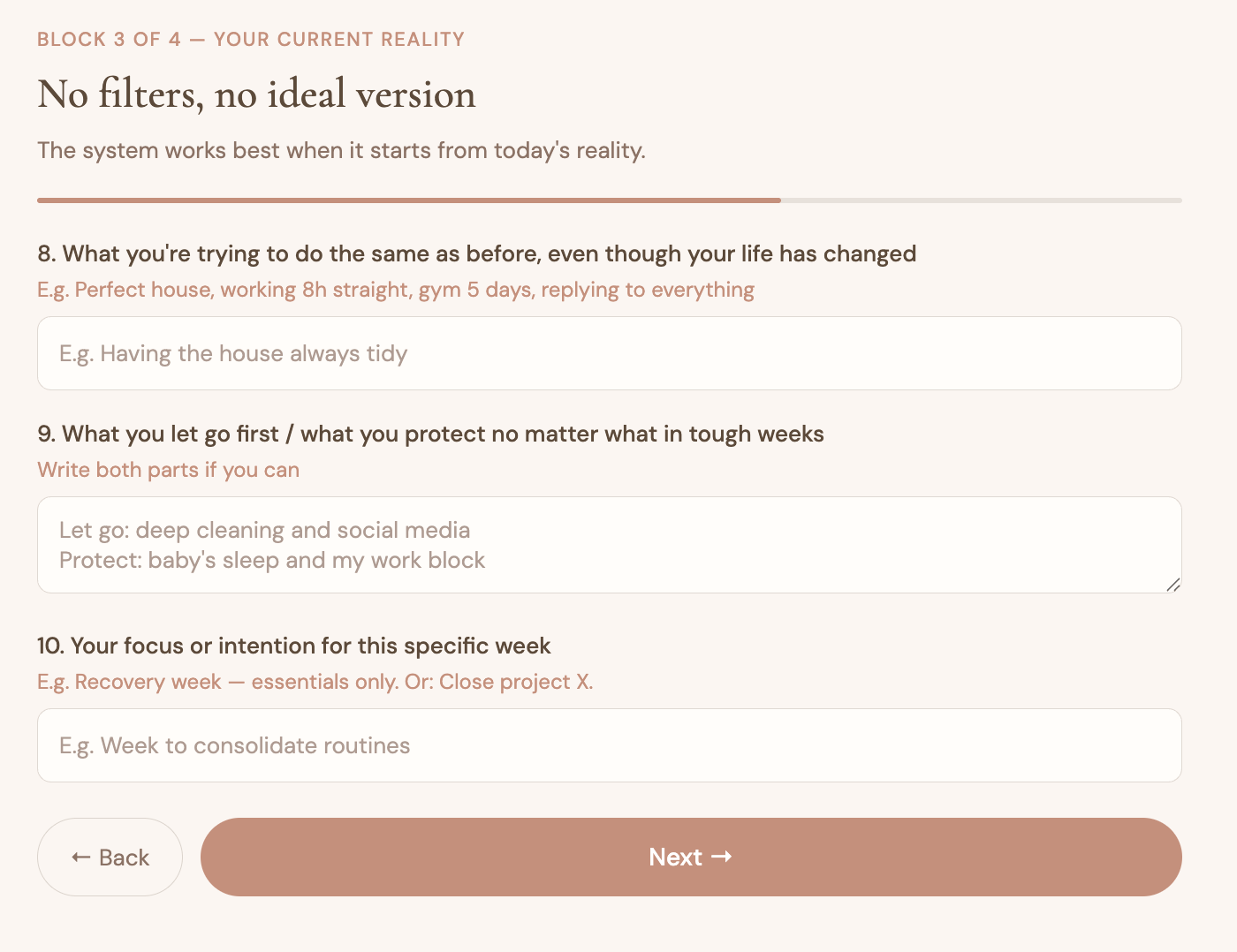 How it works: Answer 13 quick questions about your energy, priorities and family situation. In seconds, AI generates a unique weekly system designed specifically for you.