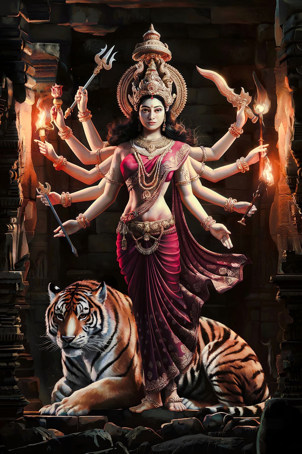 π₯β¨ A powerful depiction of Goddess Durga standing tall in divine radiance, surrounded by sacred energy and ancient symbolism. Adorned in red and gold garments, crowned with celestial jewelry, and wielding multiple weapons in her many arms, she embodies protection, strength, and spiritual authority. π Her majestic tiger sits loyally at her feet, symbolizing fearlessness and divine command. Set against a dramatic temple backdrop, this artwork radiates mythological grandeur and feminine power. Perfect for lovers of Hindu mythology, spiritual art, and epic goddess imagery. π‘οΈπΊποΈ