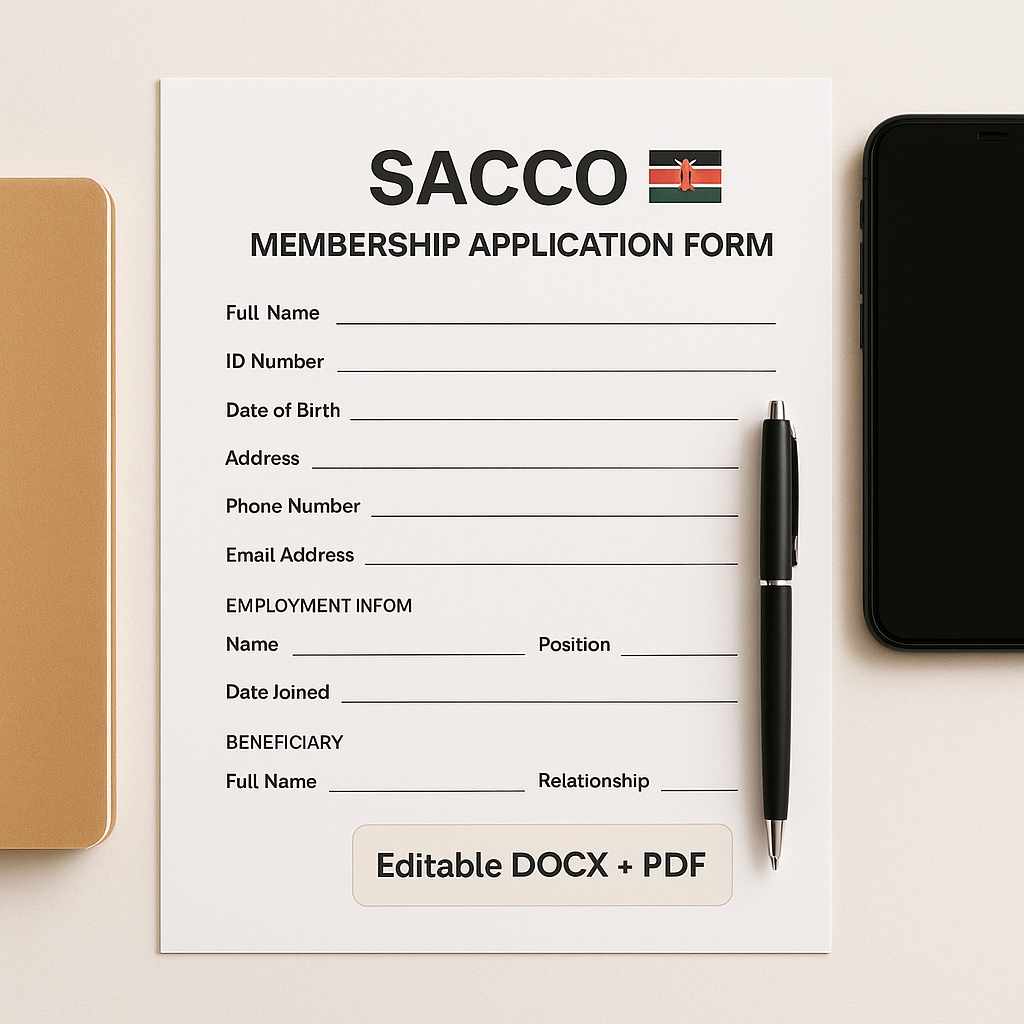 Join your SACCO with ease and confidence. This crisp, editable application form includes all the essentials—name, ID, DOB, beneficiary info—and is designed for easy fill, print, or share. Trusted by Kenyan SACCOs, chamas, and savings groups.