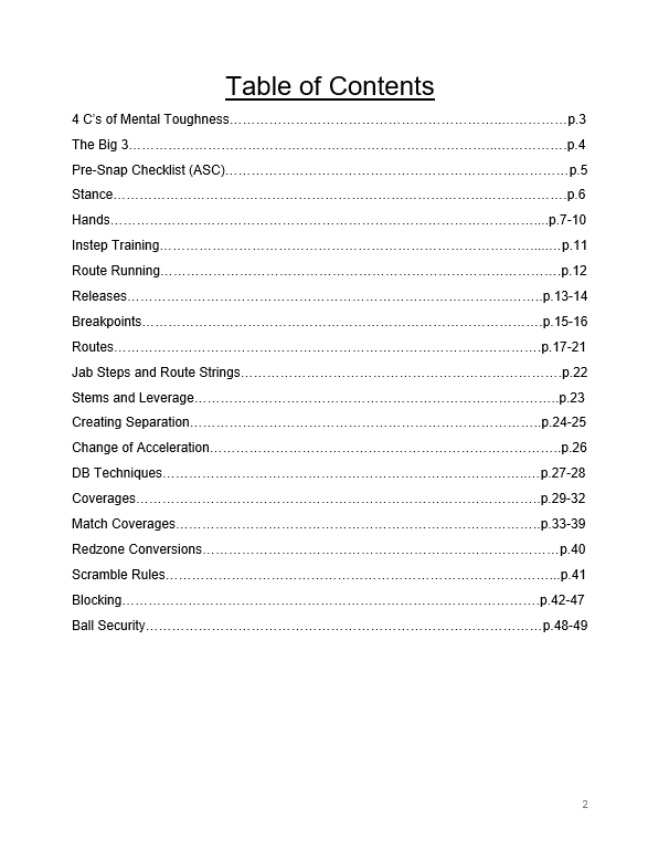 Wide Receiver Manual with comprehensive techniques and fundamentals to help you get better. Information shown is modified from my coaching experience at Kent State (FBS), Bluffton (D3), Minnesota (Big 10), and Canadian Football. This resource will help you hone your craft and improve your game!
