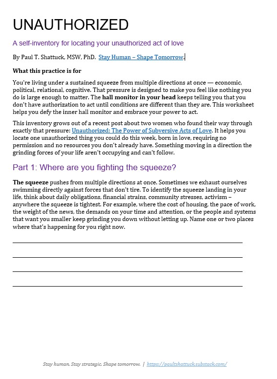 This three-page inventory helps you push back against that voice. Not by fixing the pressure. By finding the one unauthorized act of love that's already waiting for you in the margins of your life — something requiring no permission and no resources you don't already have.