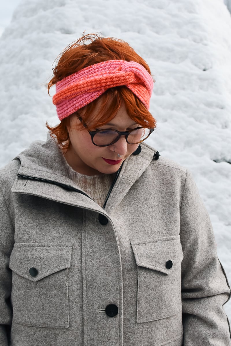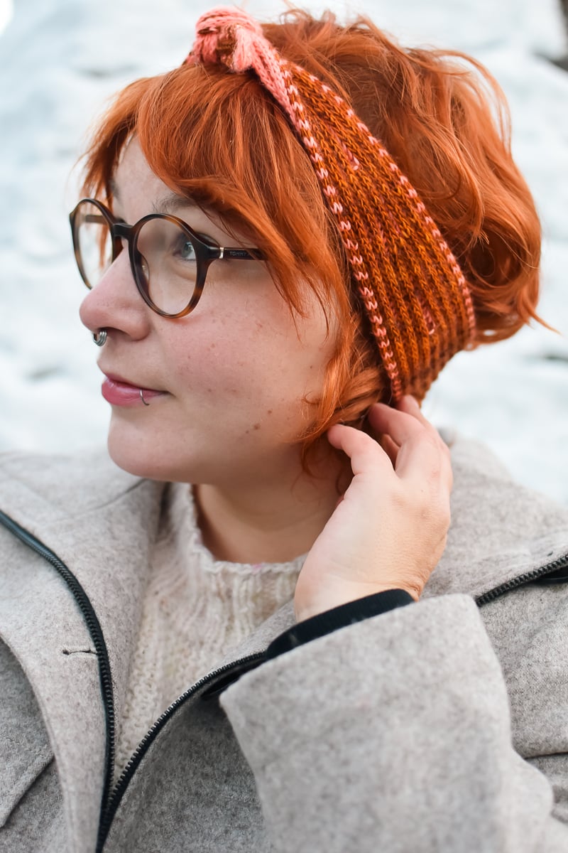 A mini scarf that doubles as a tie-headband in bold Double Brioche ribbing.