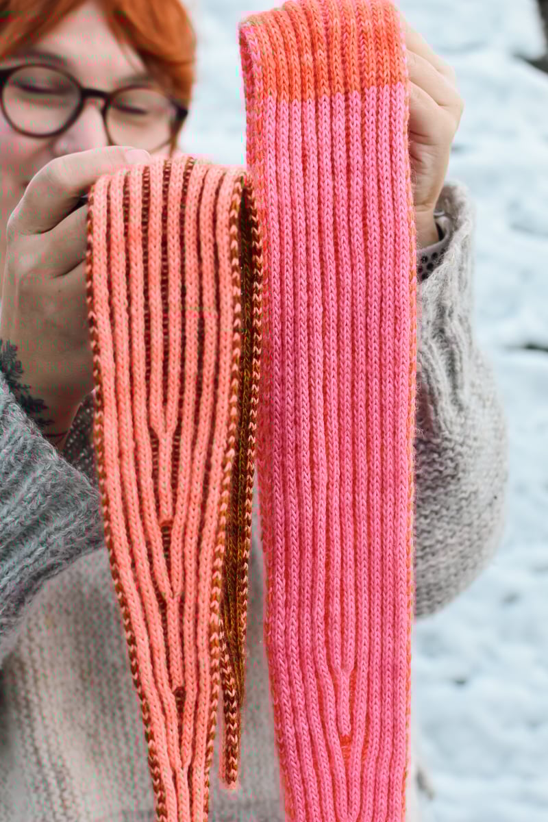 Large Version: Steppke Single by Frida Fuchs (100% SW Merino, 360 m per 100 g) in Flamingo (Color A) and Roter Neon (Color B)