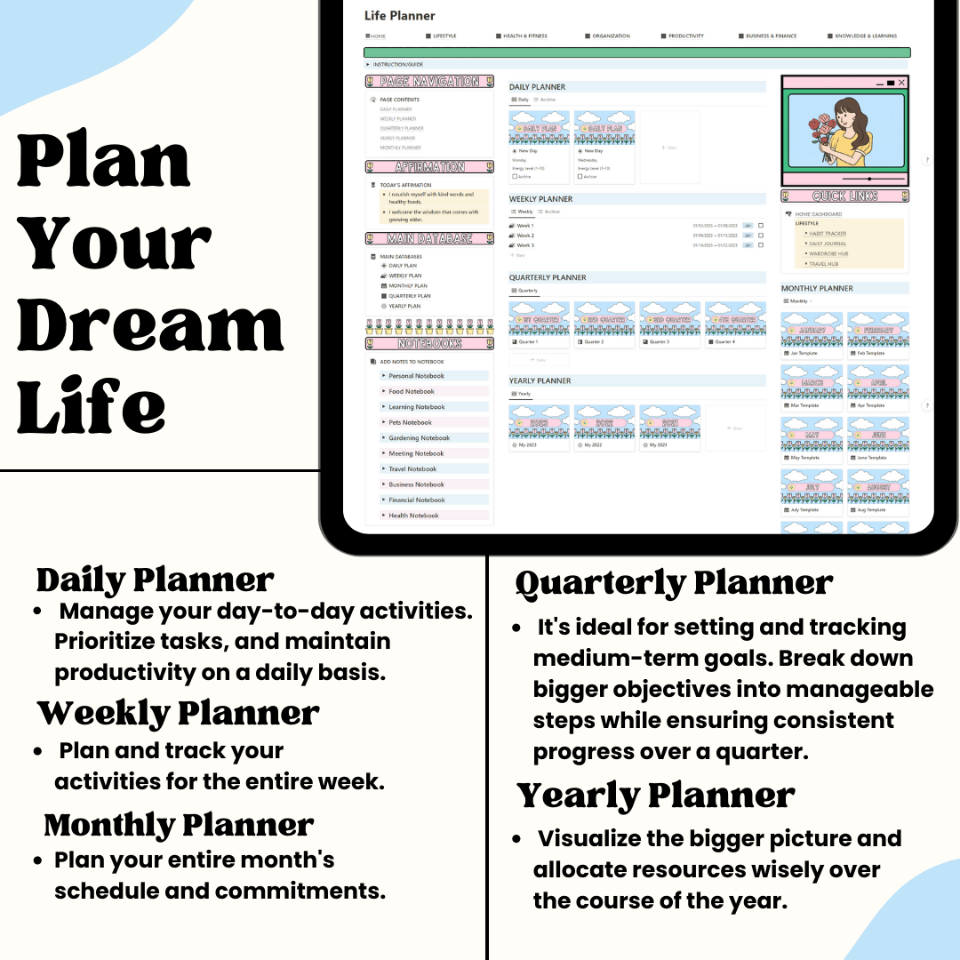 Grab my all-in-one aesthetic Notion template at a super low price! I've put in three months of learning and watching tutorials to create this. Whether you're a student, professional, or just looking to get organized, this template has you covered. It helps with tasks like managing projects, keeping track of to-dos, taking notes, and setting goals.