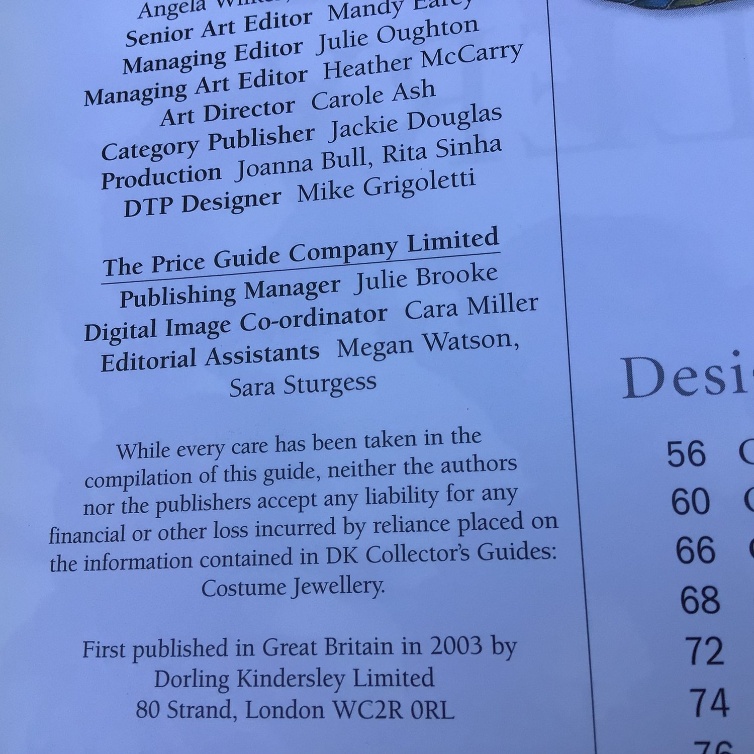 Costume Jewellery, author Judith Miller. DK Collector's Guides. Published 2003. 256pp. D/w present. Light stain to edges of d/w and small tear centre left. Otherwise good.