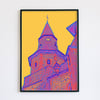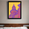 This printable wall art shows the bell tower of a church in a small French town. High vibratory colors of saffron, amethyst, and royal blue all contribute to its dramatic and intense surrealistic atmosphere. This image will add a unique vibe to any room in your house or office. It’s a surefire eye catcher.