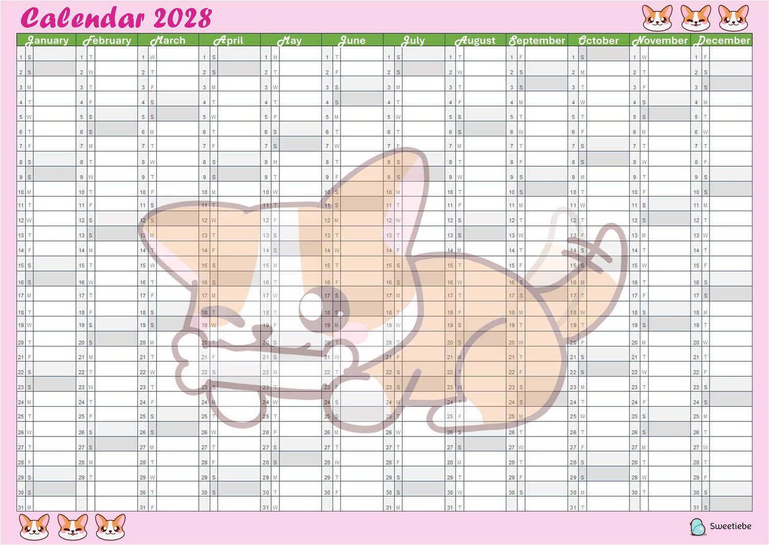 Cute Corgi Design 2028 Single Page Yearly Calendar Planner (Printable & PDF)