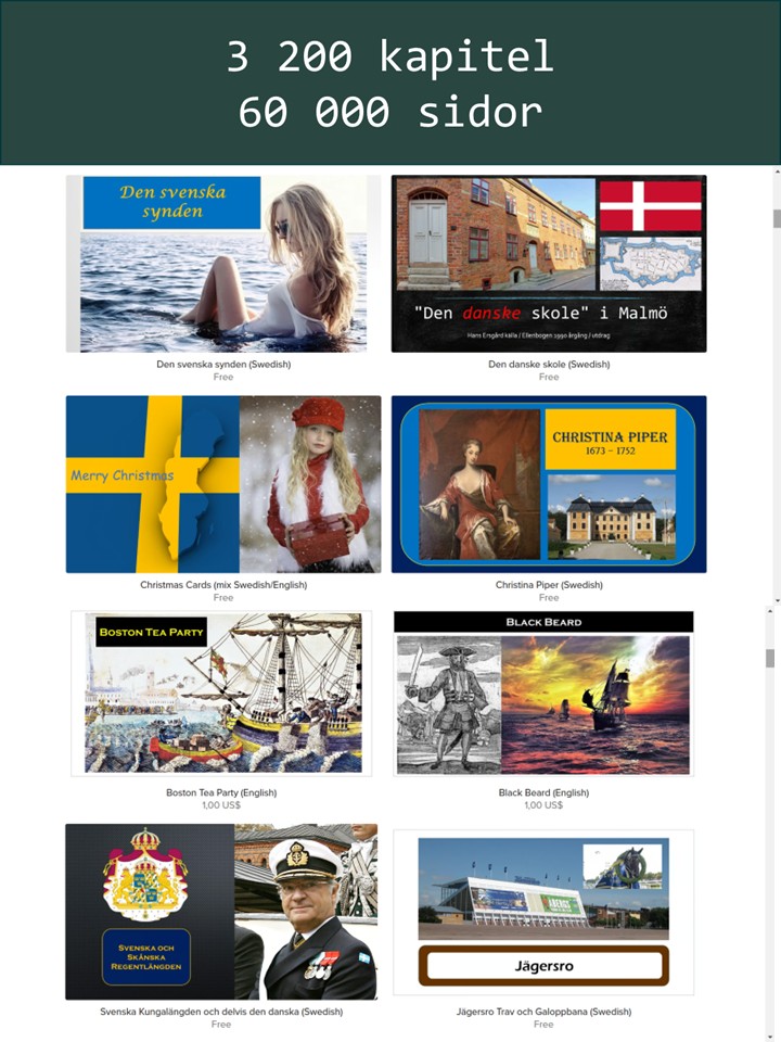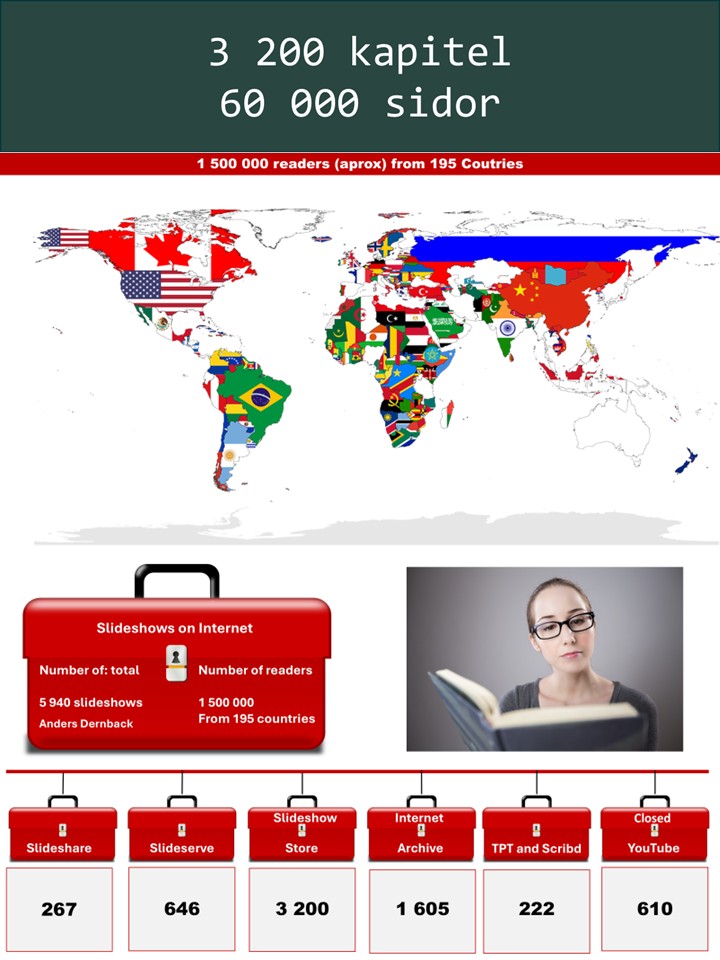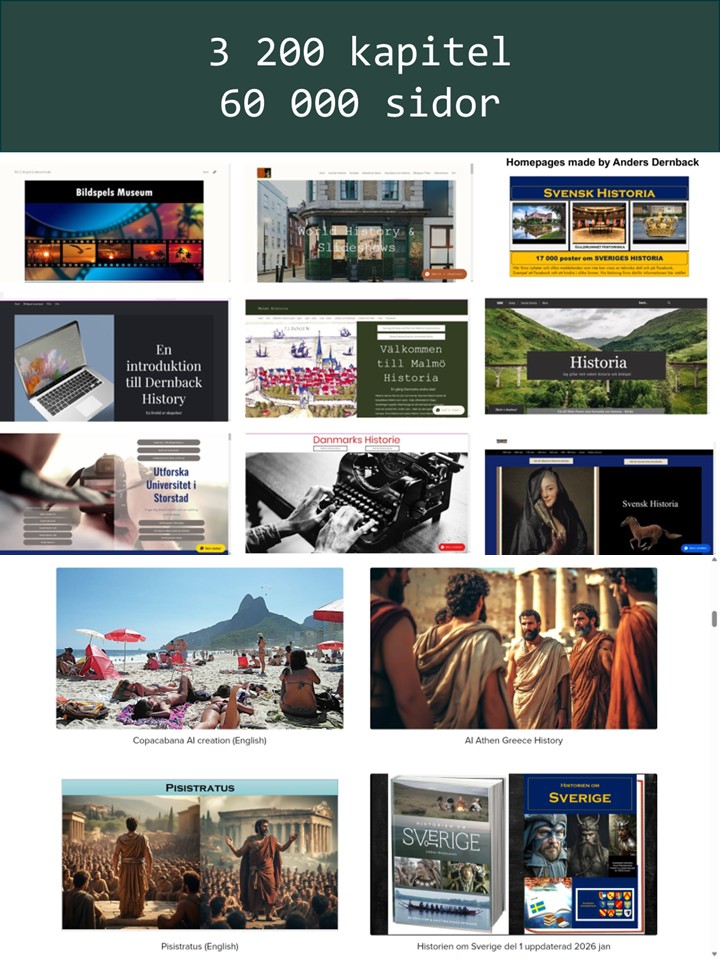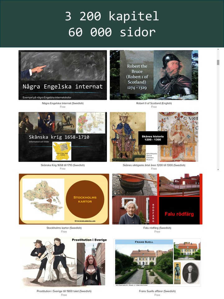 Världens största bok om historia. 3 200 kapitel, 60 000 sidor. Finns bara digitalt. Hade blivit 200 böcker om den hade tryckts upp. Varje kapitel (ett bildspel kan laddas hem som PDF fil)