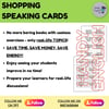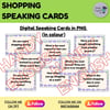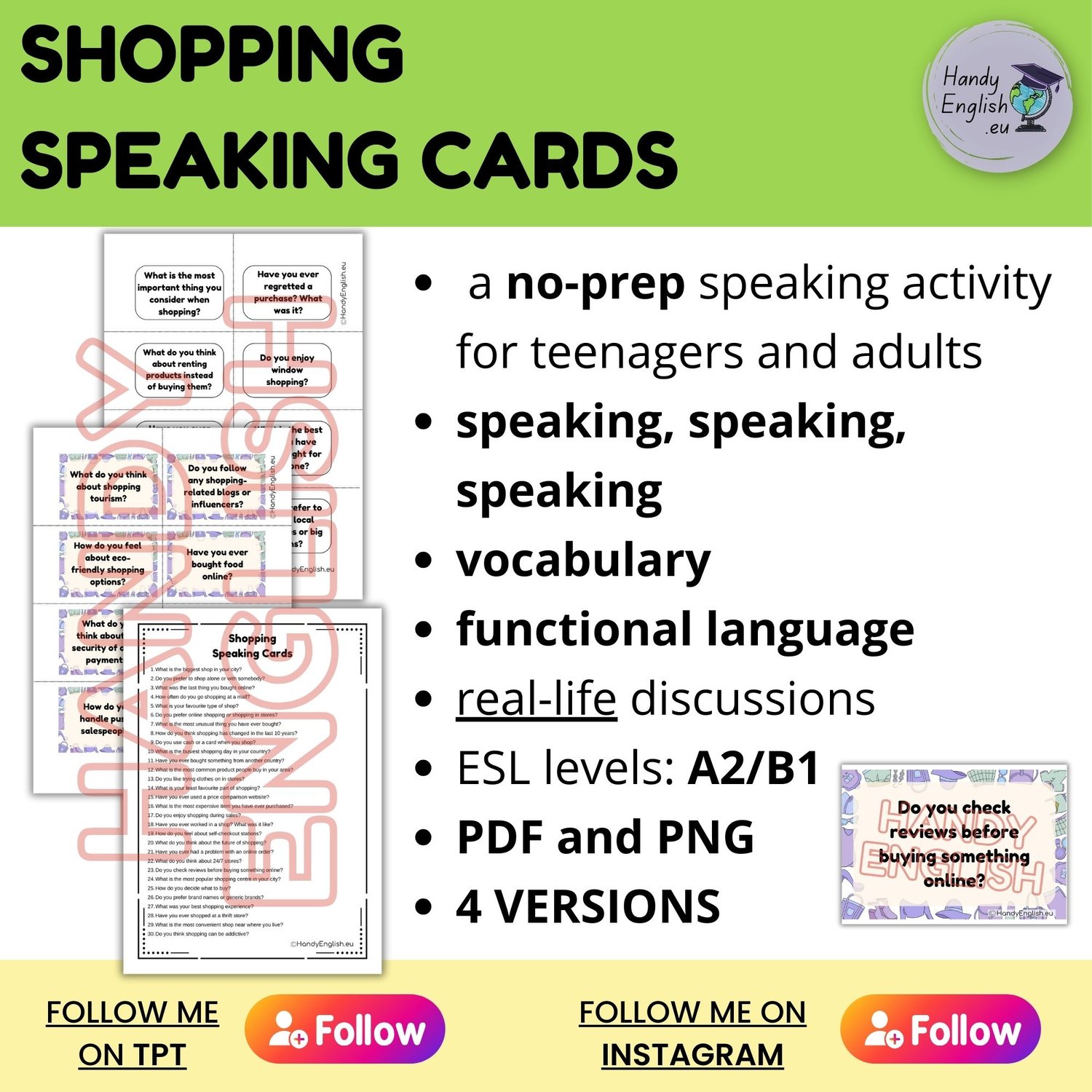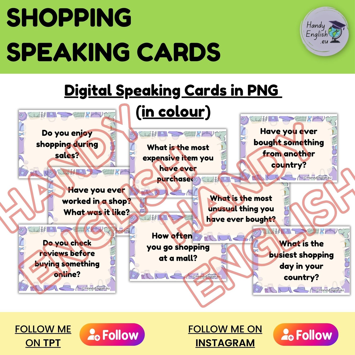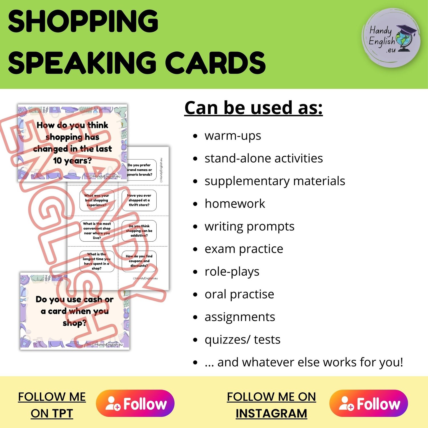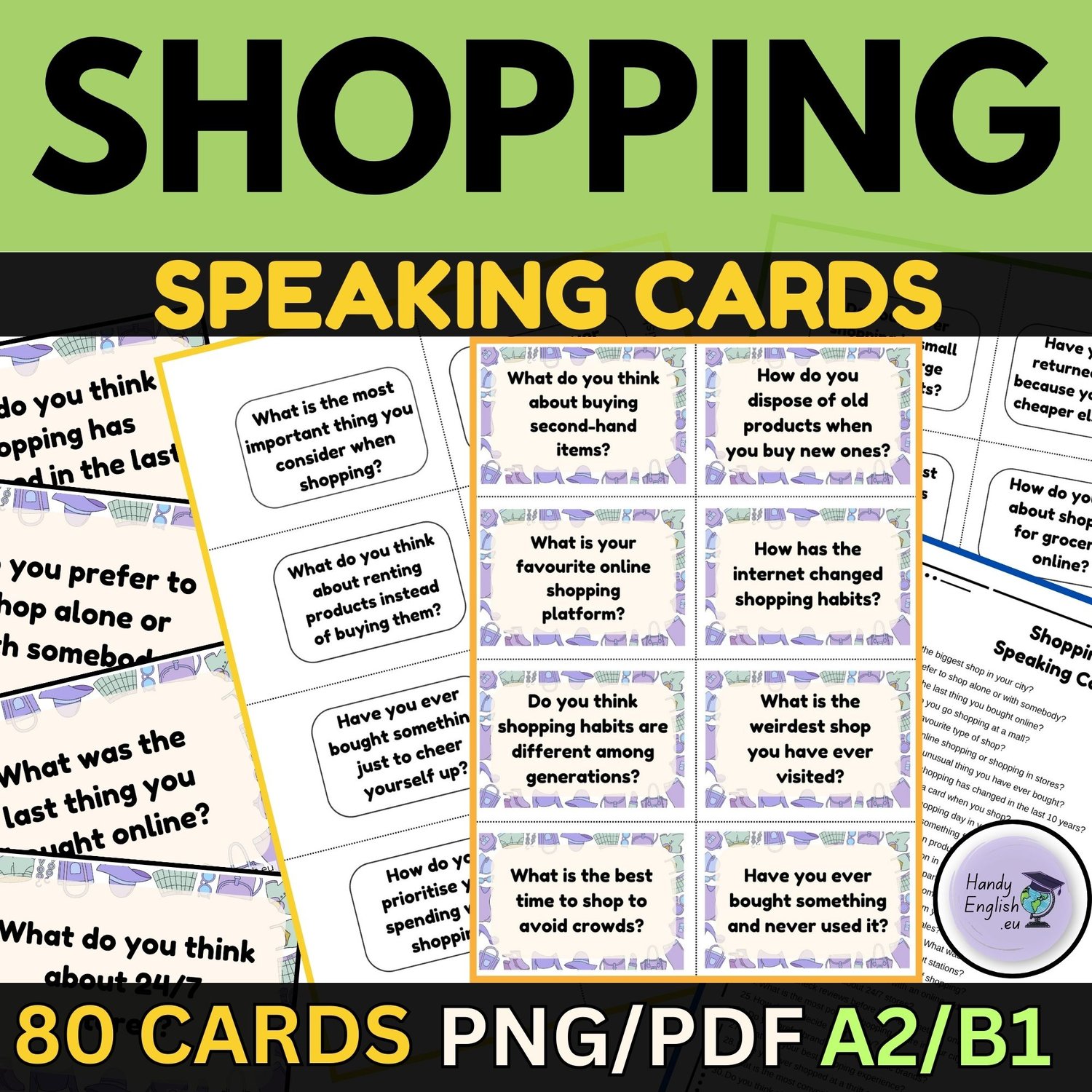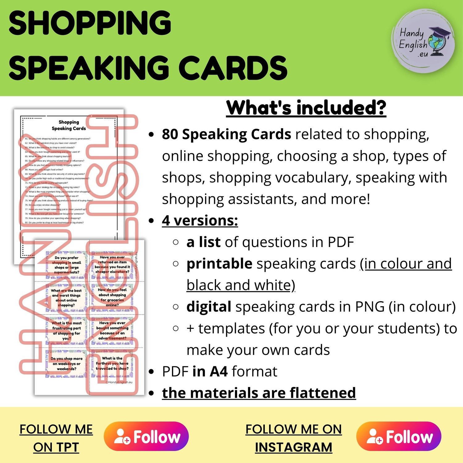 - 80 Speaking Cards related to shopping, online shopping, choosing a shop, types of shops, shopping vocabulary, speaking with shopping assistants, and more!