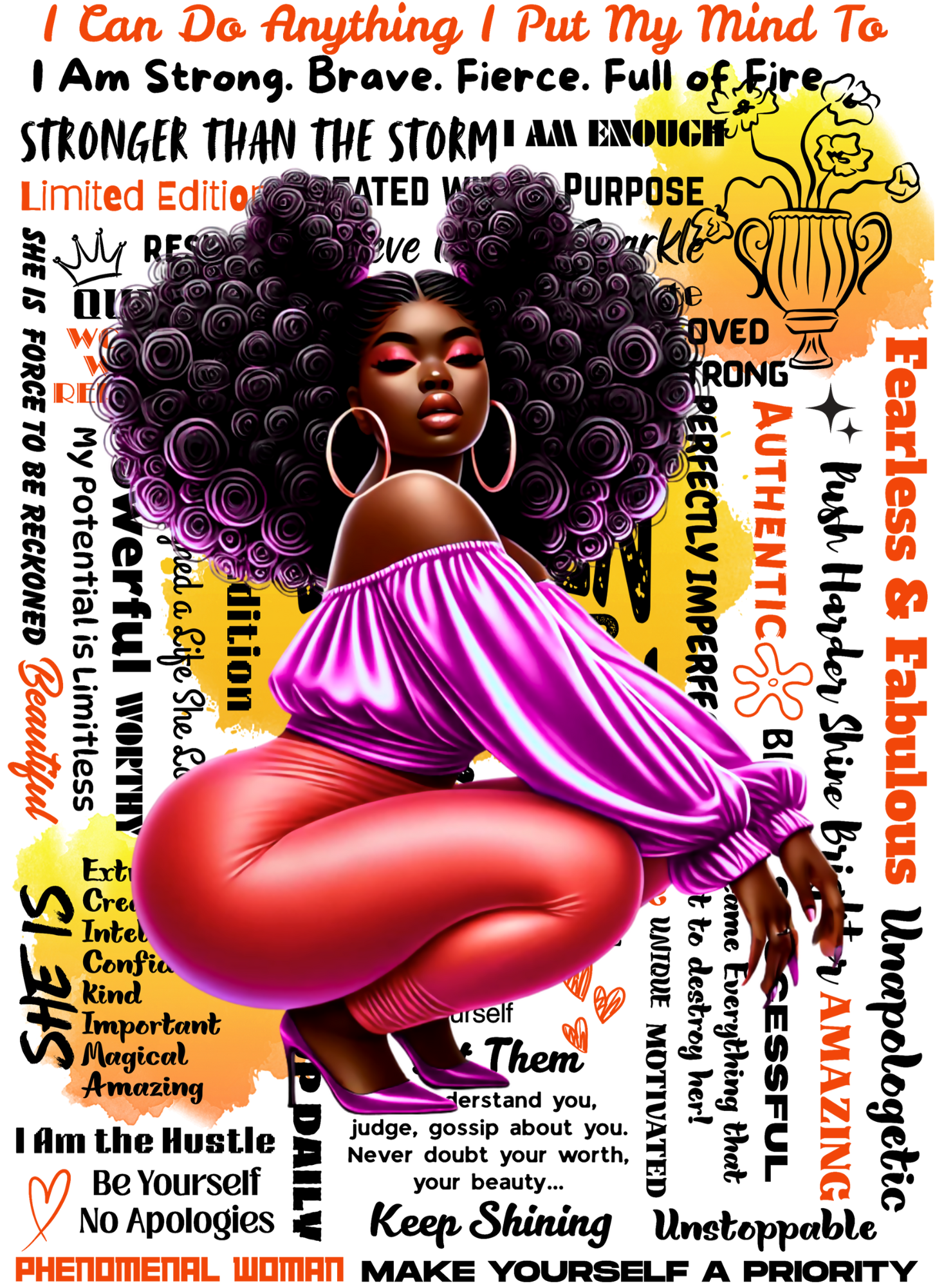 Unlock your power with this stunning A5 Empowerment Journal, featuring a bold, beautifully illustrated Black woman surrounded by uplifting affirmations like I Am Enough, Fearless & Fabulous, Stronger Than the Storm, Phenomenal Woman, and more.