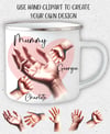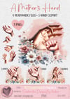 A mother’s hand. 4 readymade files inc backgrounds, depicting 1 child’s hand x 2, 2 children’s hands and 3 children ‘s hands plus 5 hand clipart filed to create your own design. Sublimation, print. 9 PNG files. Mothers Day.