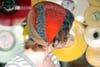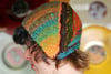 The hat is started sideways across the top front, leaving stitches along the back edge with increases, which are then worked over and downwards with decreases and short rows making the curved head shape down the back. A strip of sideways garter stitch finishes it off across the base in back.