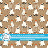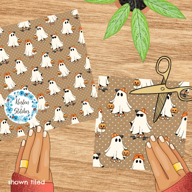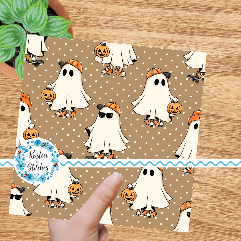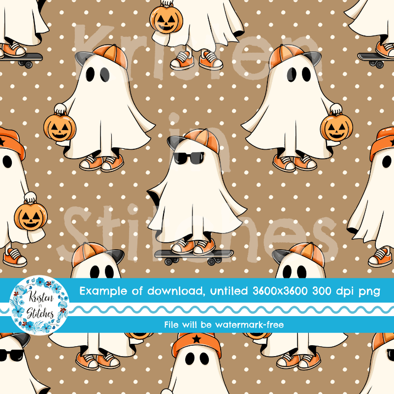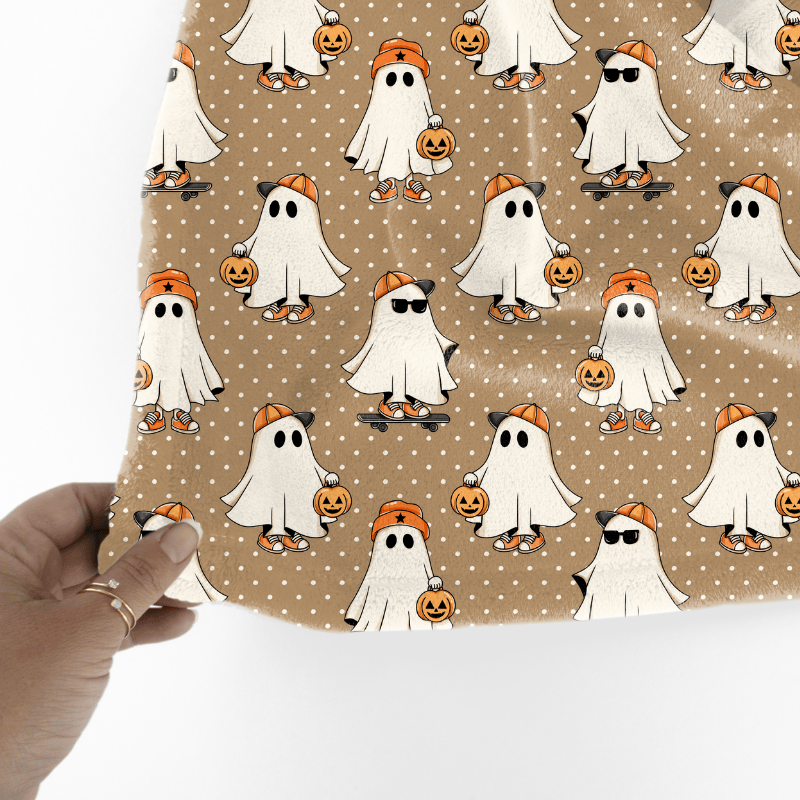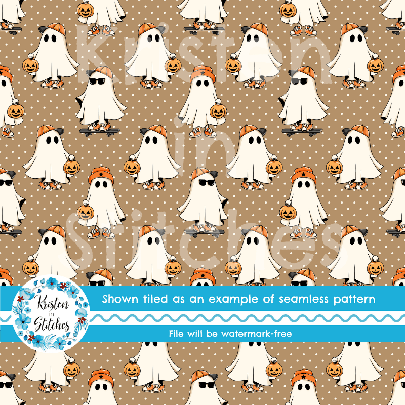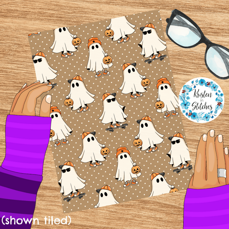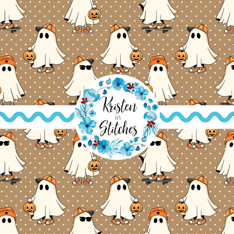 Cool kids skateboarding ghosts with baseball caps, sunglasses, sneakers and pumpkins on tan polkadots.