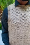 This sweater vest features an openwork lace pattern over the body which elevates the classic sweater vest design. This is a great layering piece that can be dressed up or down depending on what you pair it with. The vest is made from the bottom-up with shaping for the armholes and the crew neckline. The sweater is knit in the round and then flat as you shape the armholes and the neckline, and the shoulders are seamed together using a 3-needle bind off.