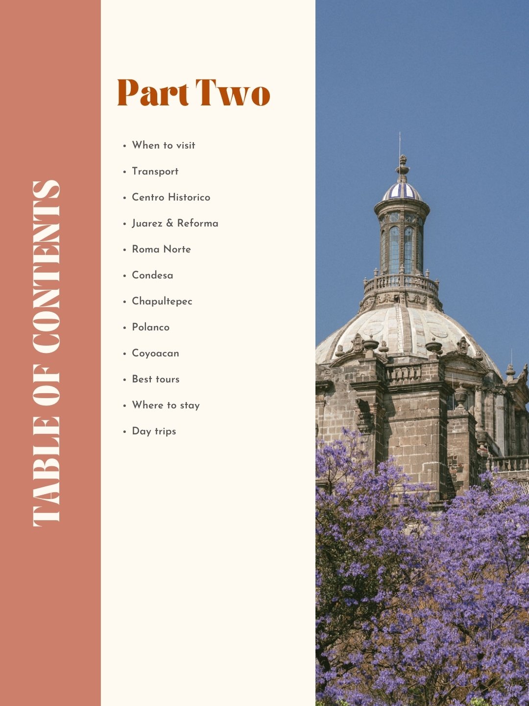 This Mexico City Travel Guide contains two sections with an easy-to-navigate, clickable table of contents: