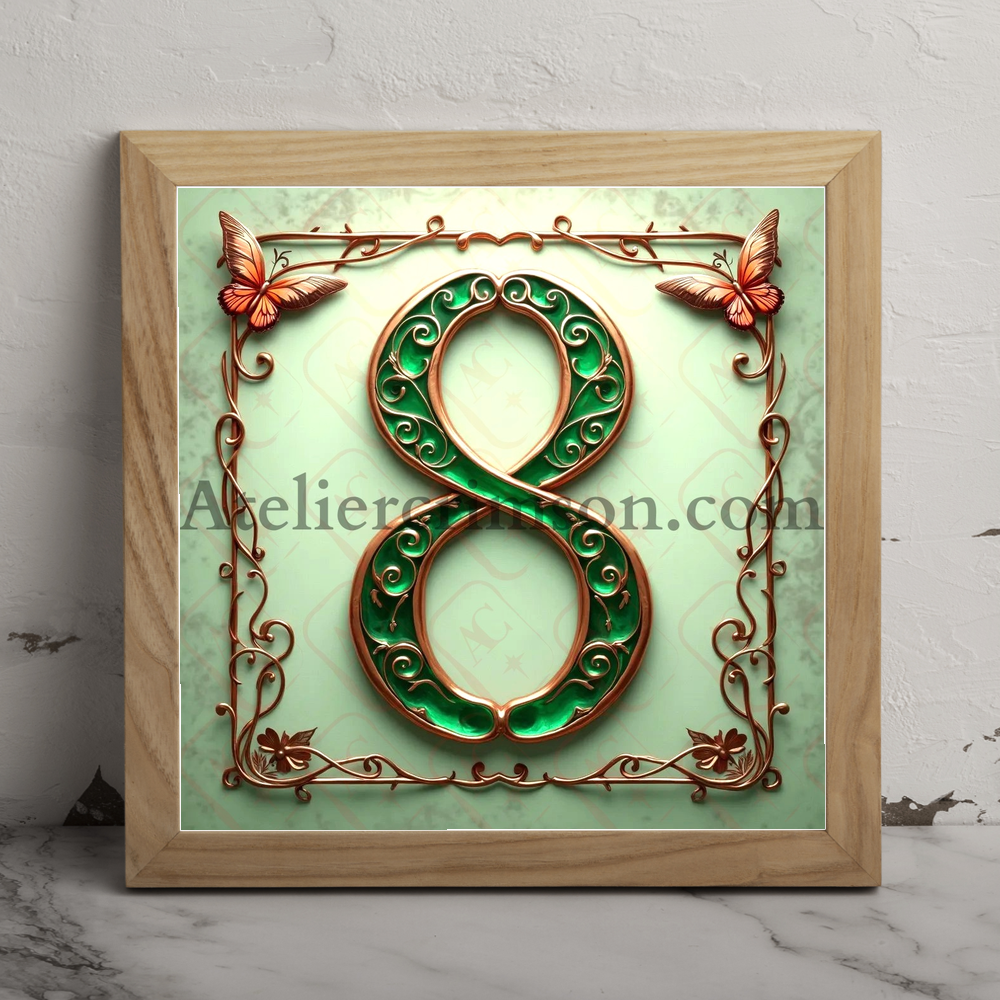 Number 8 emerald and copper Art Nouveau Intricate design with floral patterns, butterflies, and vines. Elegant sage green background. Perfect for vintage lovers and typography enthusiasts.