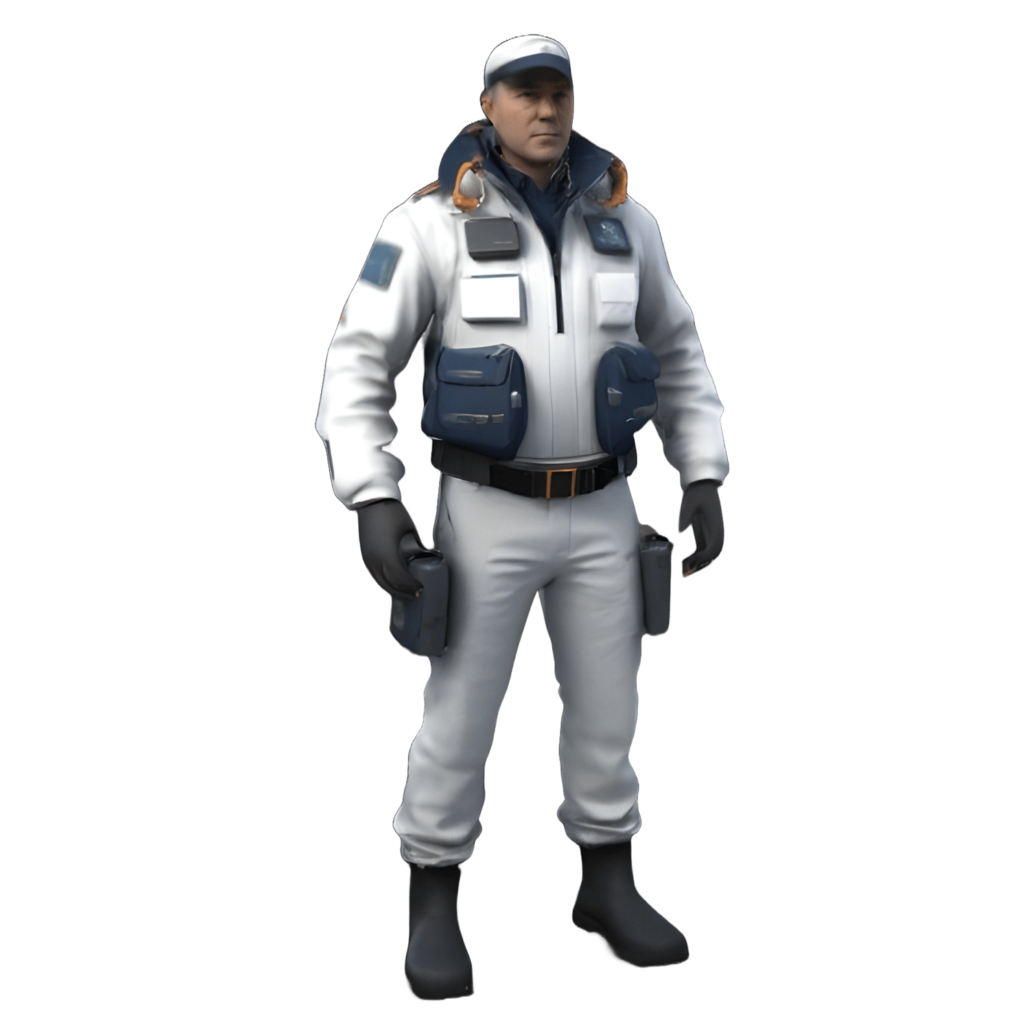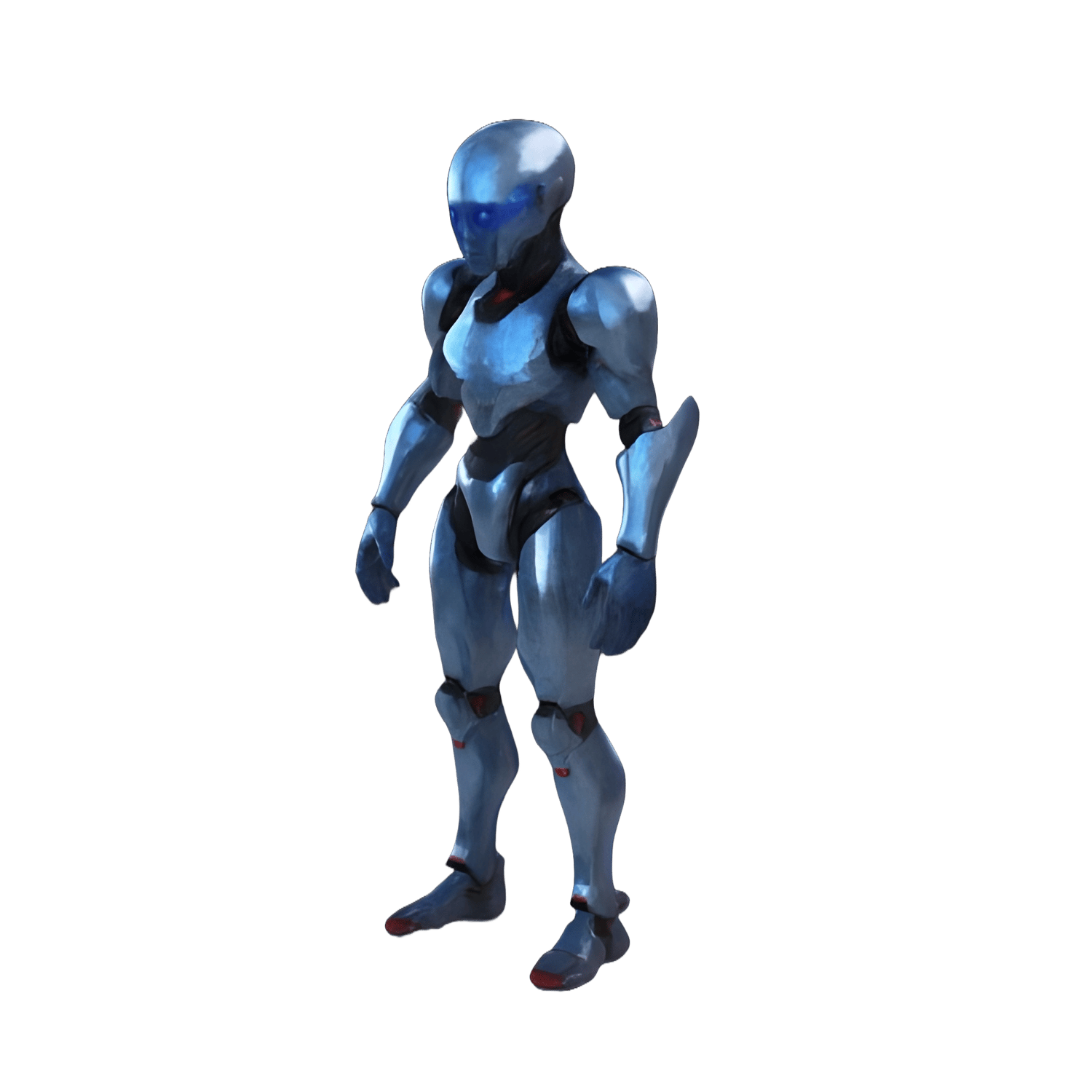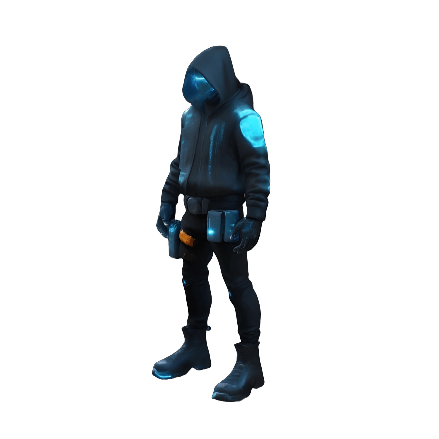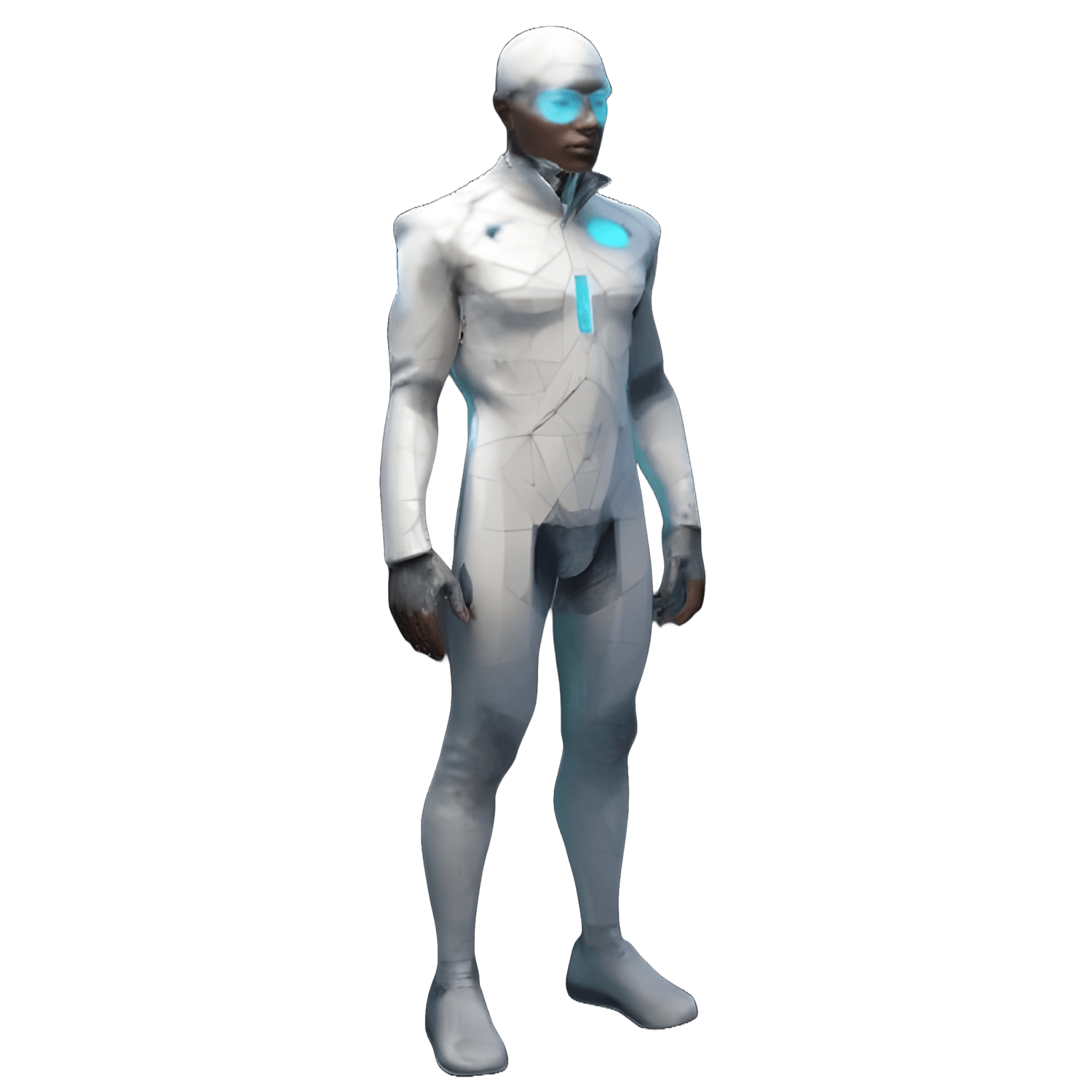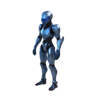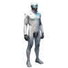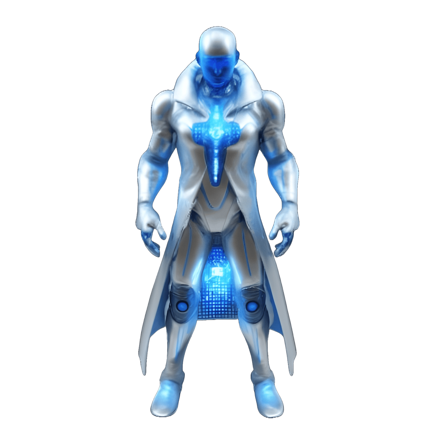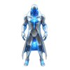 - A luminescent figure in white with striking blue energy patterns and a flowing coat