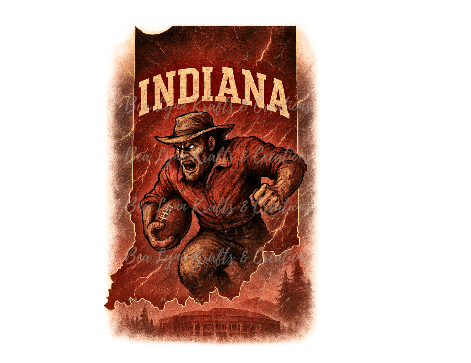 GET LOUD, HOOSIERS! This Indiana Hoosiers football-themed transparent PNG hits like a linebacker blitz. A fierce, armored Hoosier football warrior bursts through the crimson-cracked Indiana state outline, gripping a glowing football and wearing old-school grit with modern edge. Rain falls, dirt flies, and Memorial Stadium rests powerfully at the base of the design. Bold “INDIANA” or “HOOSIERS” lettering dominates the layout in classic block font. It’s Big Ten football, born in the Midwest, and ready to power your merch to the end zone.