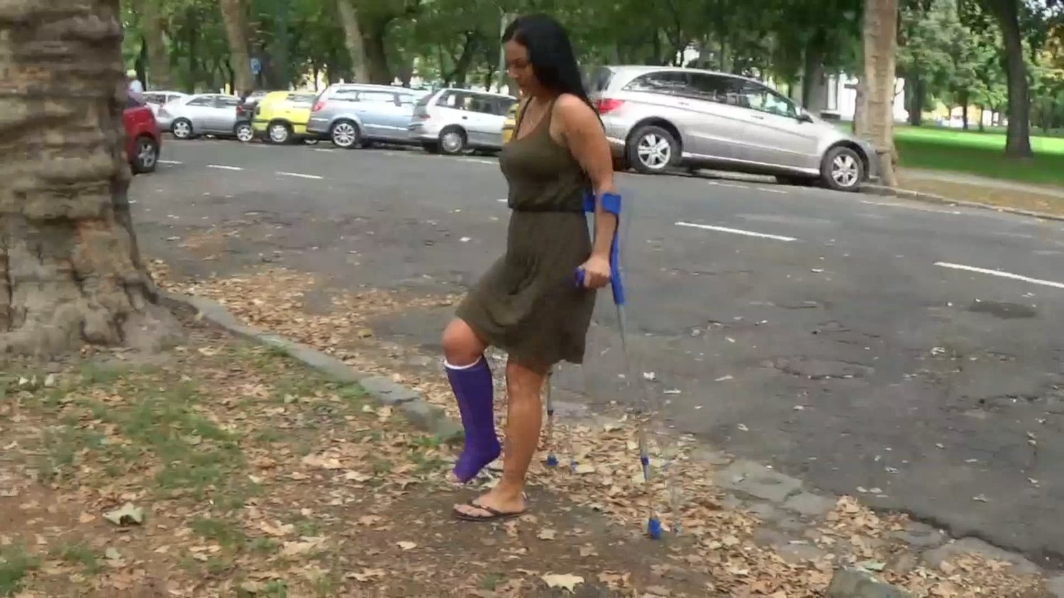 This is a great crutching clip with Adriana when she crutch around in the park with a flipflop on her left foot and a purple short leg cast on her right foot.At the end she sits down to rest and is wiggling her toes for us.
