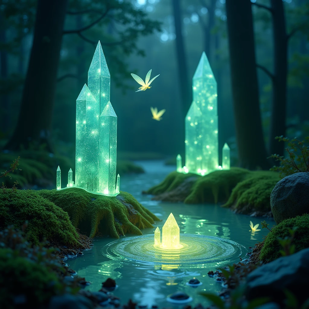 Crystal Springs" - In a misty forest glade, crystalline formations rise from the earth like glowing gems, their aquamarine light reflecting off a gentle stream. Luminous butterflies dance around these magical monuments, creating an atmosphere of pure enchantment.