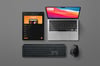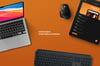 Photorealistic laptop and tablet mockup pack featuring 4 isolated objects in a flat-lay scene: a MacBook Air, an iPad Pro, a Logitech MX Keys keyboard, and a Logitech MX Master 3 mouse, with editable Smart Objects and independent lights & shadows — 7000 × 5000 px at 300 DPI.