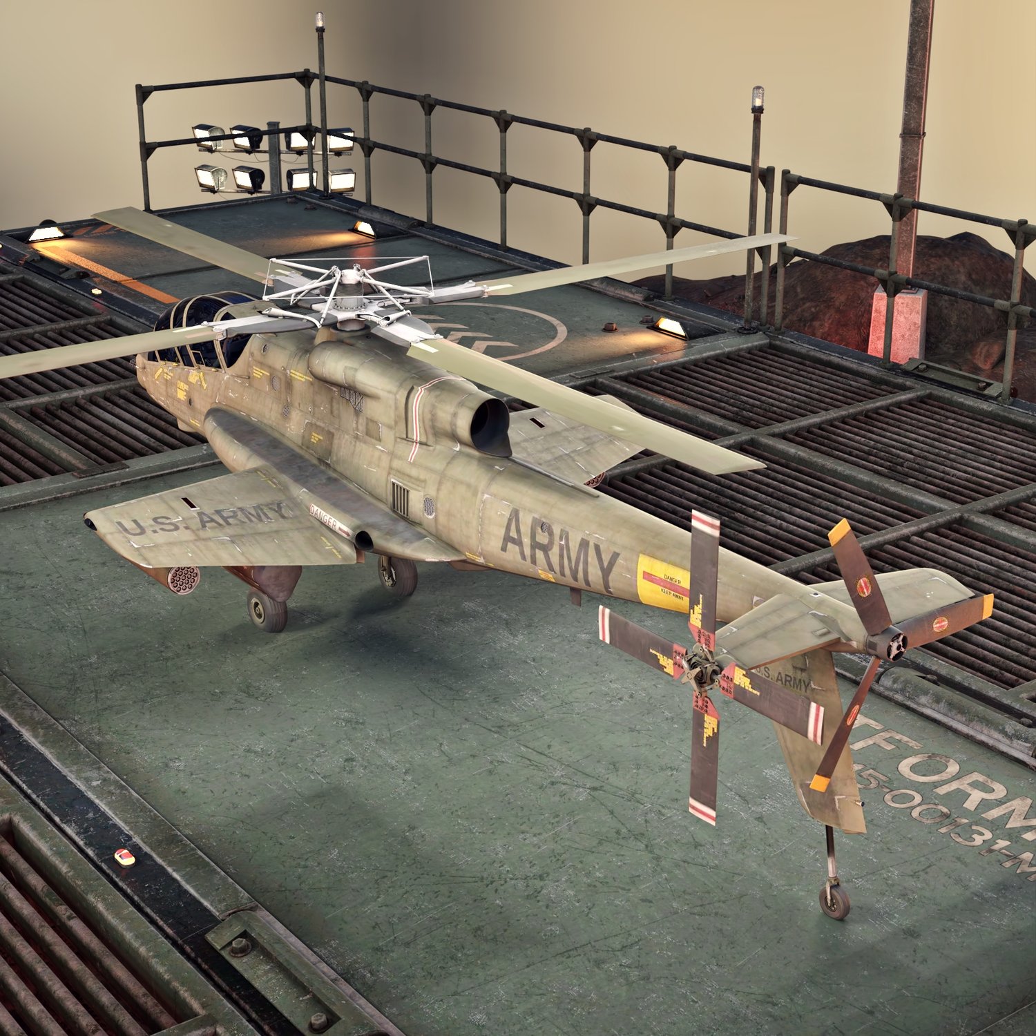 A very cool looking attack helicopter, developed in the USA in the Vietnam war times. Though the program was cancelled in the end, the helicopter is a great legacy of the coolest design. Strategically significant and great looking. Converted and rigged for use in DAZ. Has a lot of rockets, which are rigged, for more realistic pictures. The hatches are also rigged for realistic compositions.