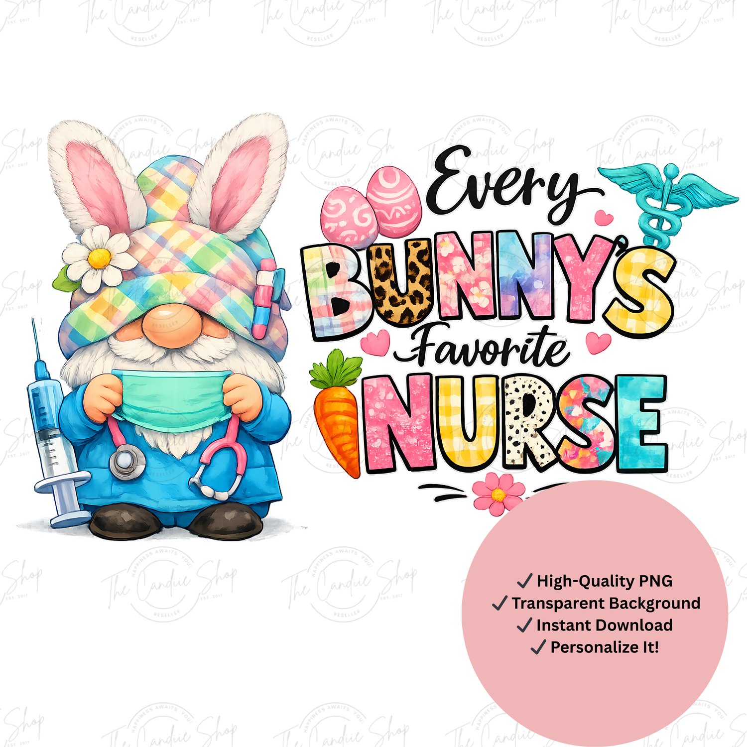 Celebrate spring with this cute and colorful Every Bunny’s Favorite Nurse PNG featuring an adorable Easter nurse gnome design on a transparent background. This high-detail digital artwork is perfect for creating custom t-shirts, sweatshirts, mugs, tote bags, stickers, cards, and other fun spring craft projects.