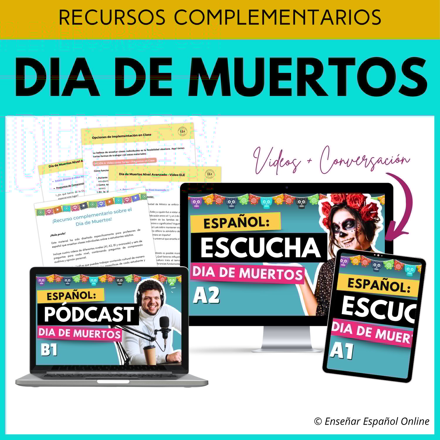 ¡Pero eso no es todo! Recibirás 4 videos originales creados con enfoque pedagógico sobre el Día de Muertos (A1, A2, B1 y Avanzado) + PDF completo con preguntas de comprensión auditiva para cada nivel. 🎬✨
