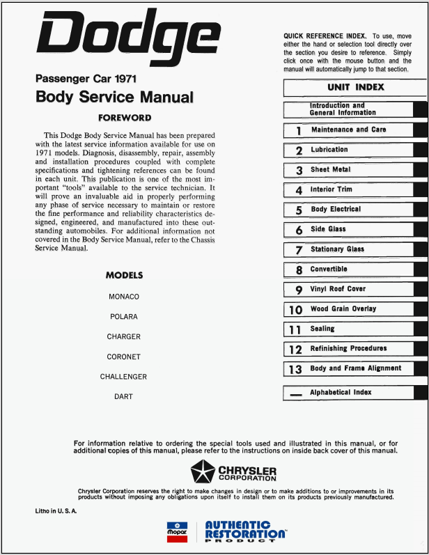 1971 Dodge Challenger Dart Charger Coronet Polara Monaco Body Service Manual
